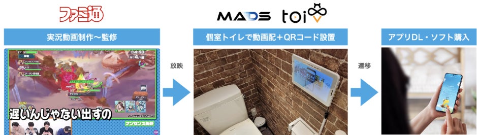 ゲームメディア「ファミ通」が、株式会社トイビーと株式会社MADSと連携し、個室トイレに設置されたデジタルサイネージ『トイビー』でゲーム実況動画の配信を開始します。