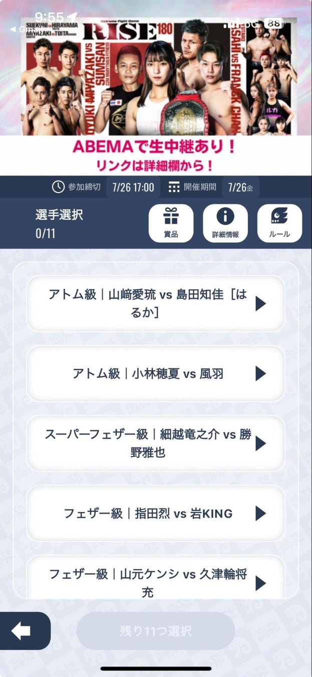 • 対象は全11試合で、勝敗のほか「KOTKO勝ち」や「判定勝ち」も選択可能。