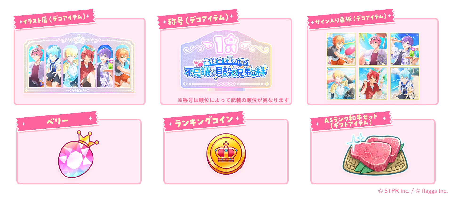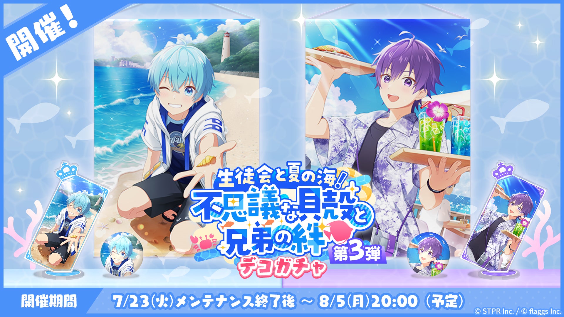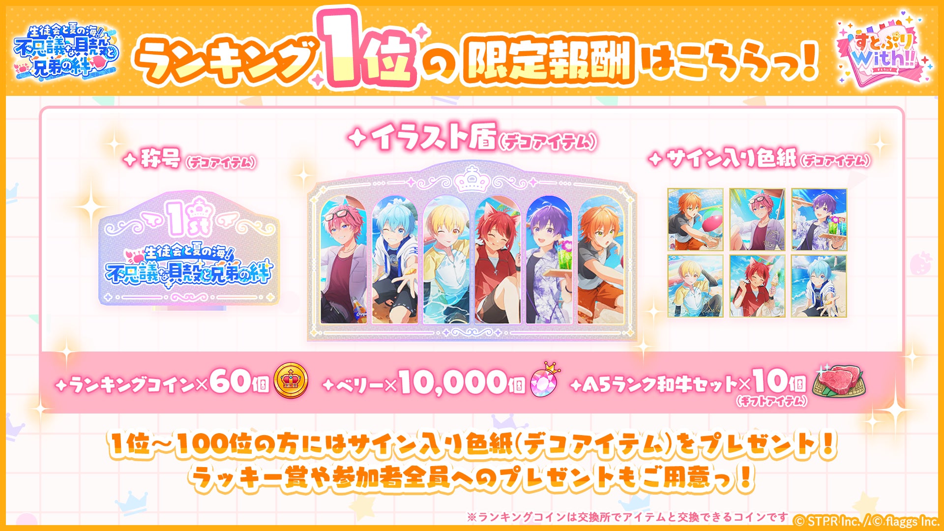 株式会社flaggsと株式会社STPRは、7月23日より「すとぷり」の公式ゲームアプリ『すとぷりWith!!(すとうぃず)』にて、ランキング形式のイベント「生徒会と夏の海!不思議な貝殻と兄弟の絆 応援イベント」を開催します。