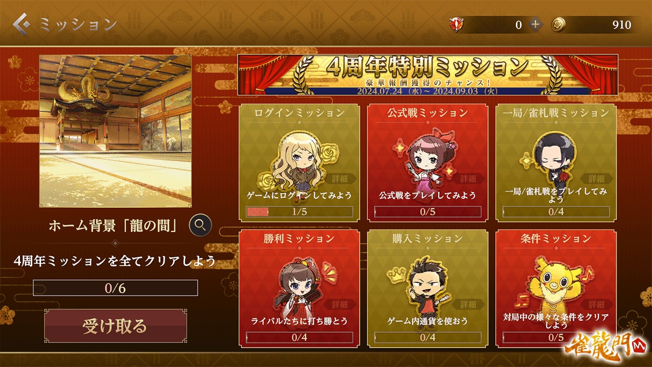 特別ミッションをクリアすることで、様々なアイテムを手に入れることができ、全てのミッションを達成すると限定のホーム背景「龍の間」が獲得できます。