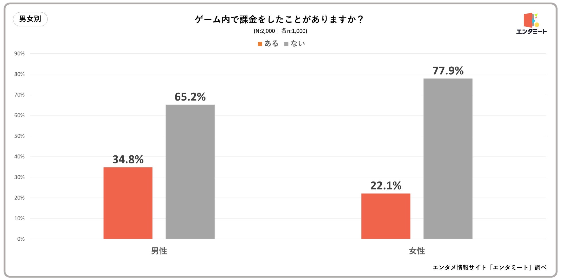 - ゲーム内課金経験者は28.5%、男性34.8%、女性22.1%で約13%の差。