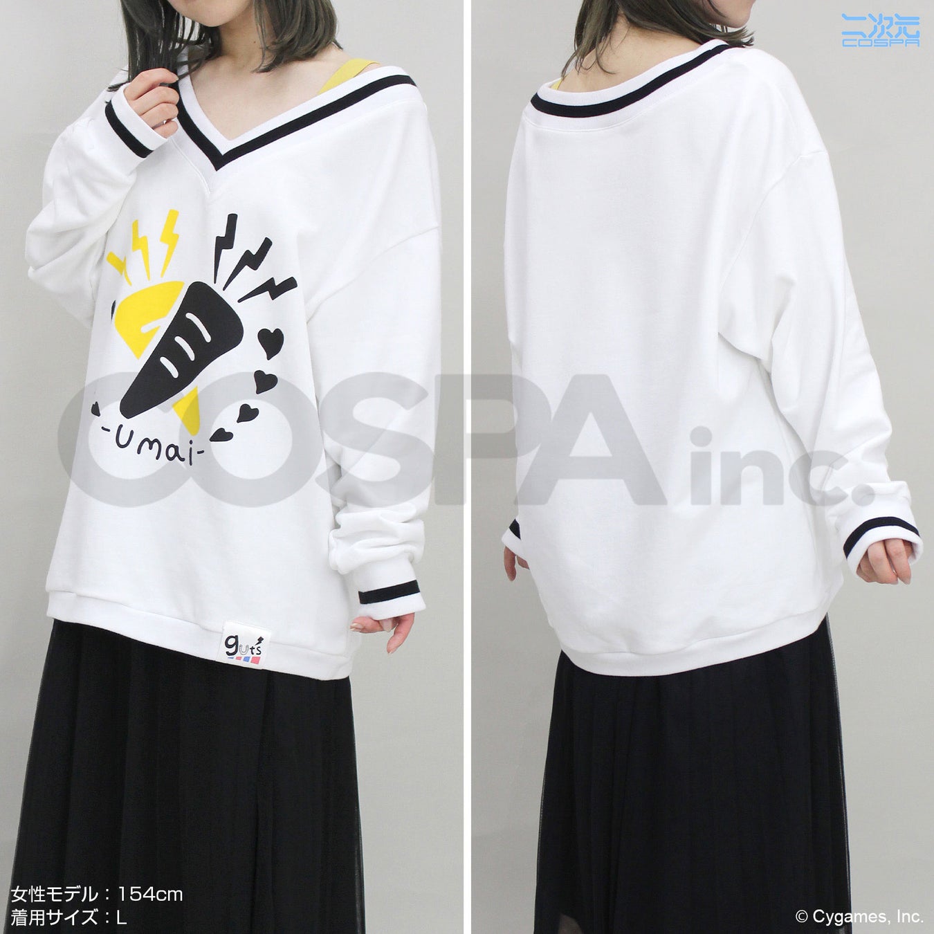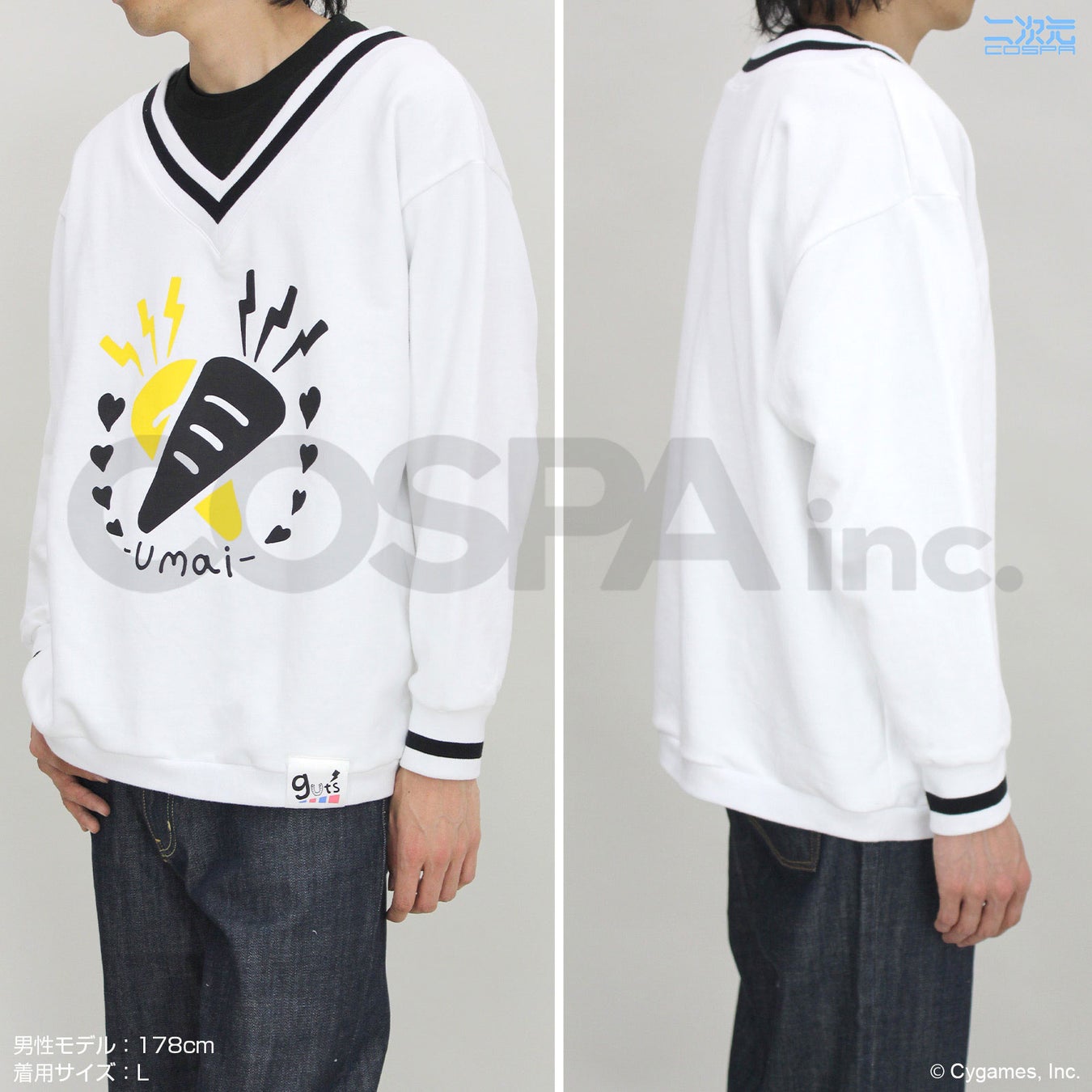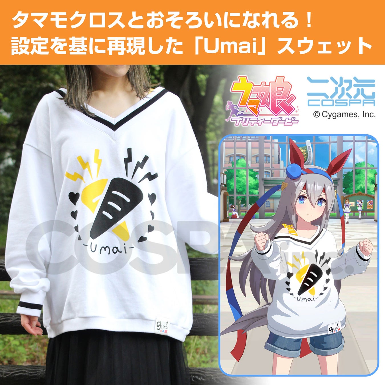 このスウェットは、タマモクロスが着用しているデザインを忠実に再現しており、フロントには「Umai」のロゴが鮮やかにプリントされています。