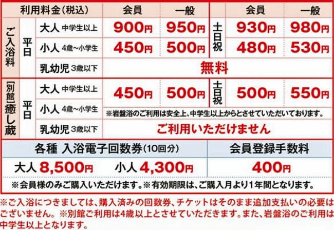 7月1日(土) ~ 9日(日) | 創業祭記念第1弾 電子回数券得々SALE ・大人入浴電子回数券10回分 通常 8,500円 ⇒ 7,500円(税込) ・子供入浴電子回数券10回分 通常 4,300円 ⇒ 3,800円(税込) |