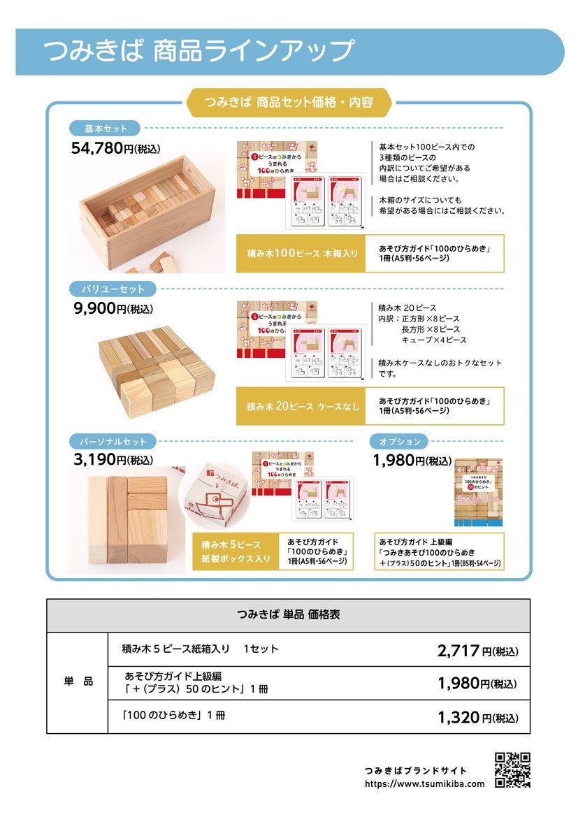 このセットには、国産の積み木20ピースと基本のあそび方ガイド「5ピースのつみきからうまれる100のひらめき」が含まれており、価格は9,900円(送料・税込み)です。