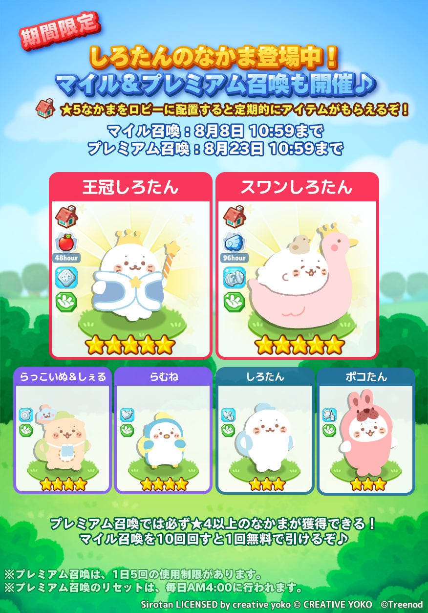 また、「★5 王冠しろたん」や「★5 スワンしろたん」などのキャラクターが登場し、さまざまな方法で仲間にすることができます。