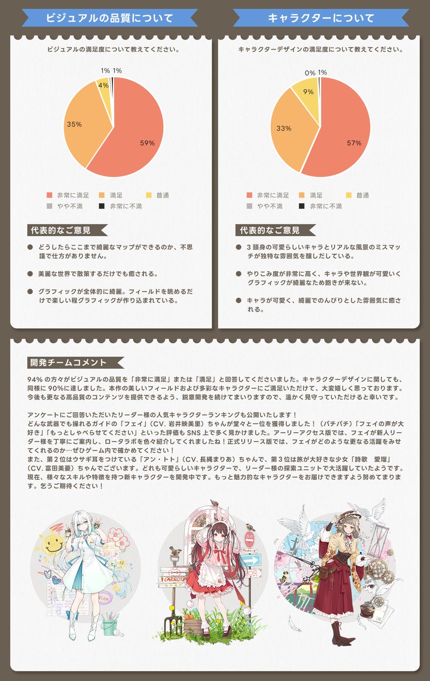 特に、ビジュアルやキャラクターデザインについては90%以上が好評を寄せています。