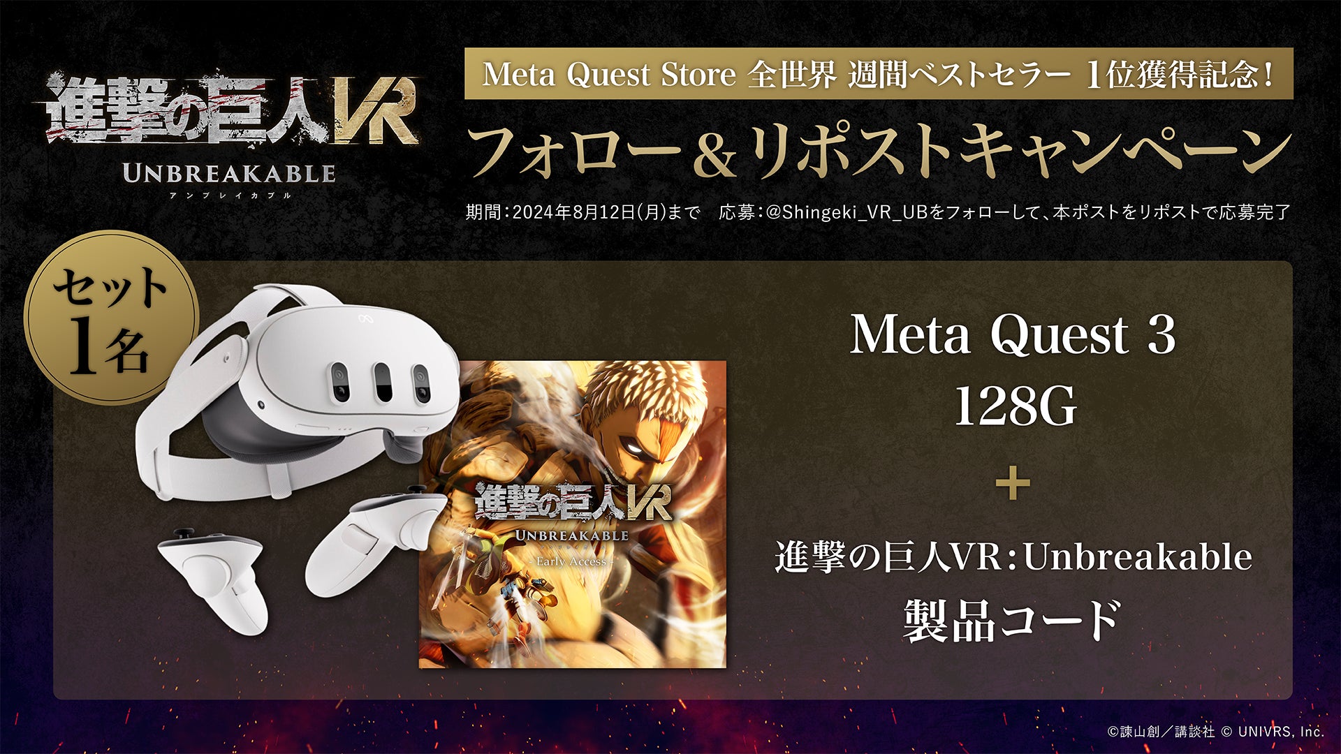 - タイトル『進撃の巨人VR: Unbreakable』がMeta Quest Storeで週間ベストセラー1位を獲得。