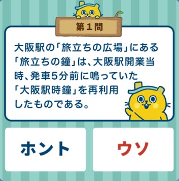 クイズは「光る柱時計がある?」「0番線があった?」などのホント・ウソの2択形式で、全問正解者の中から150名に「JR西日本オリジナル電車ごっこヒモ」が抽選でプレゼントされます。