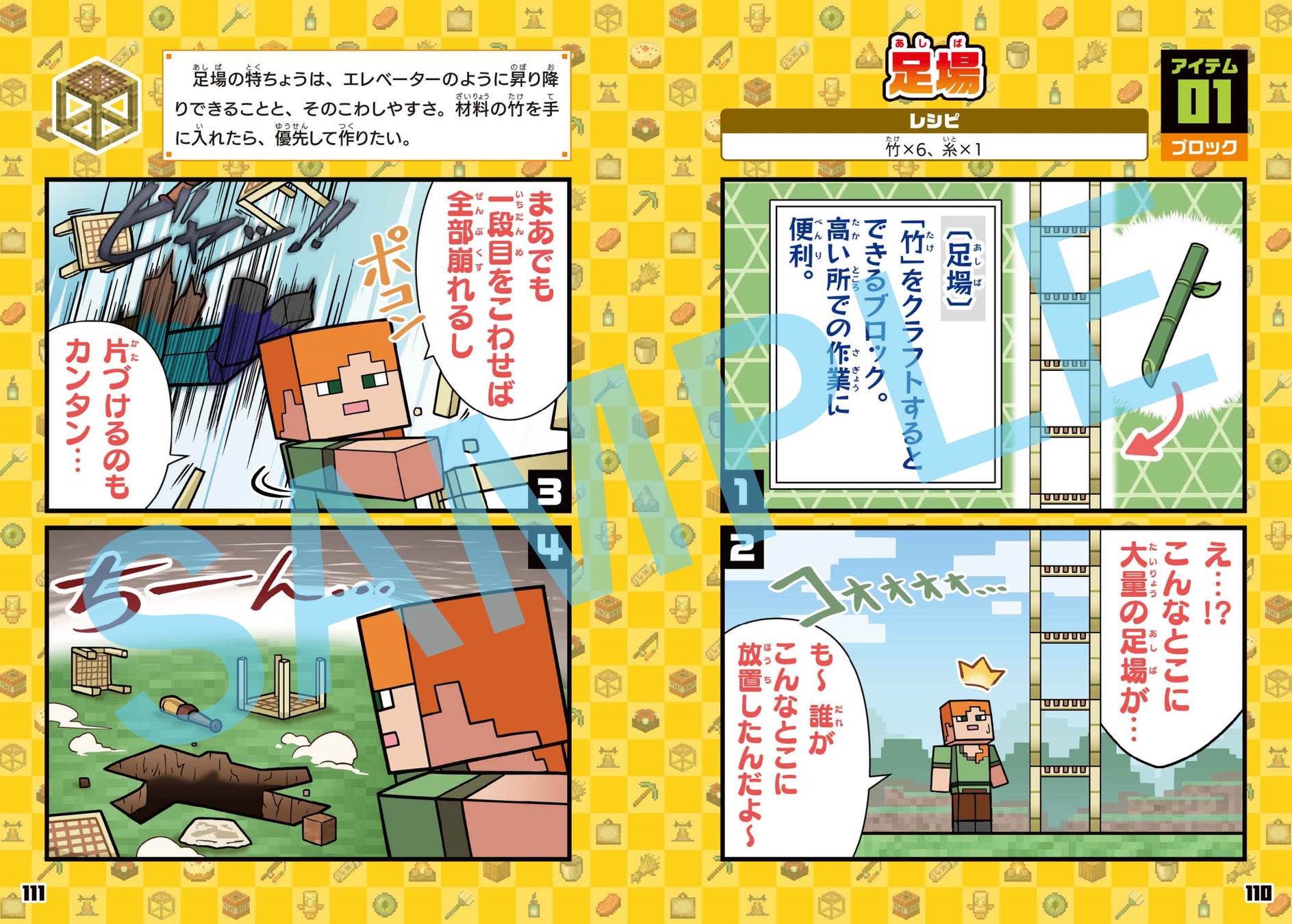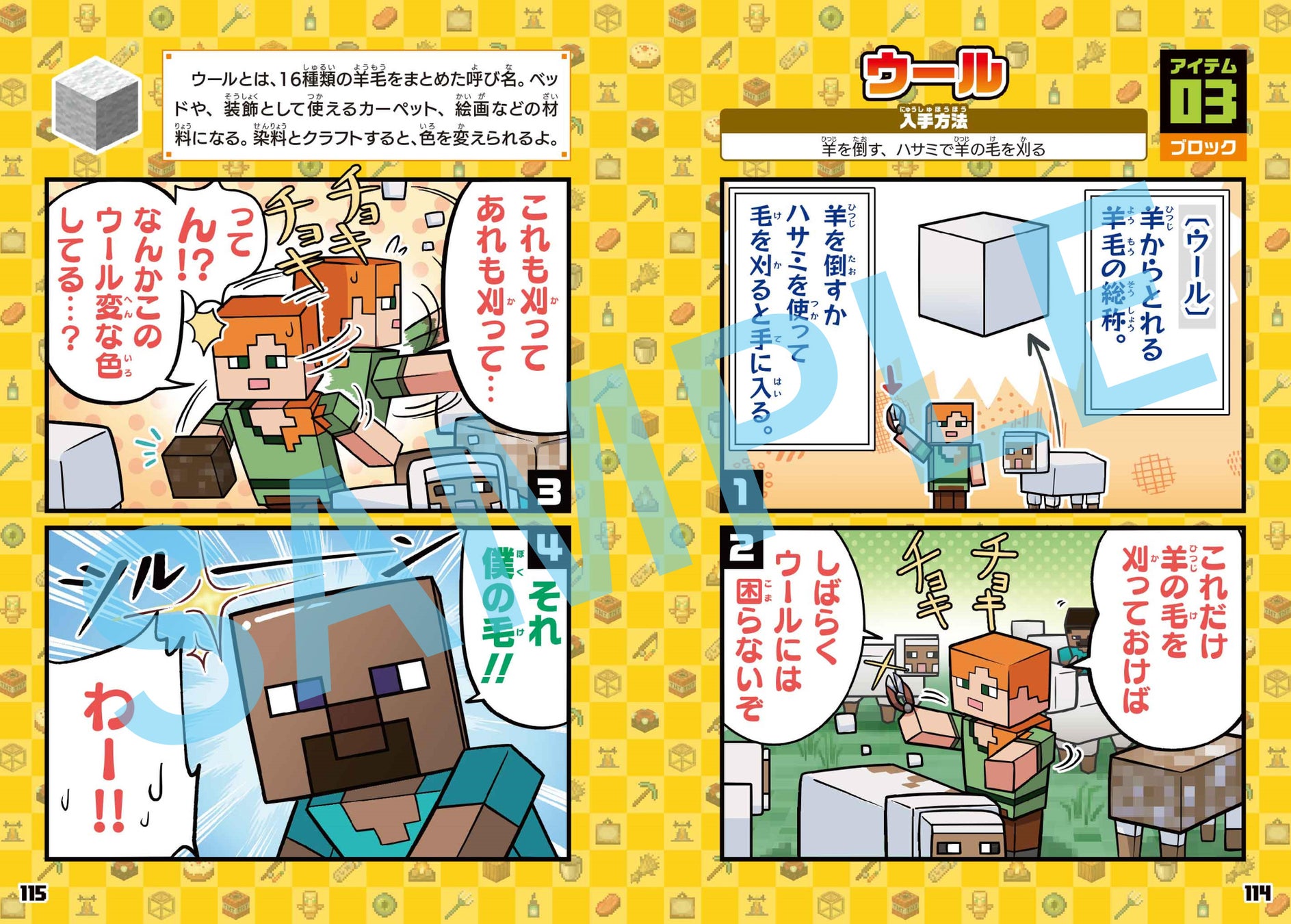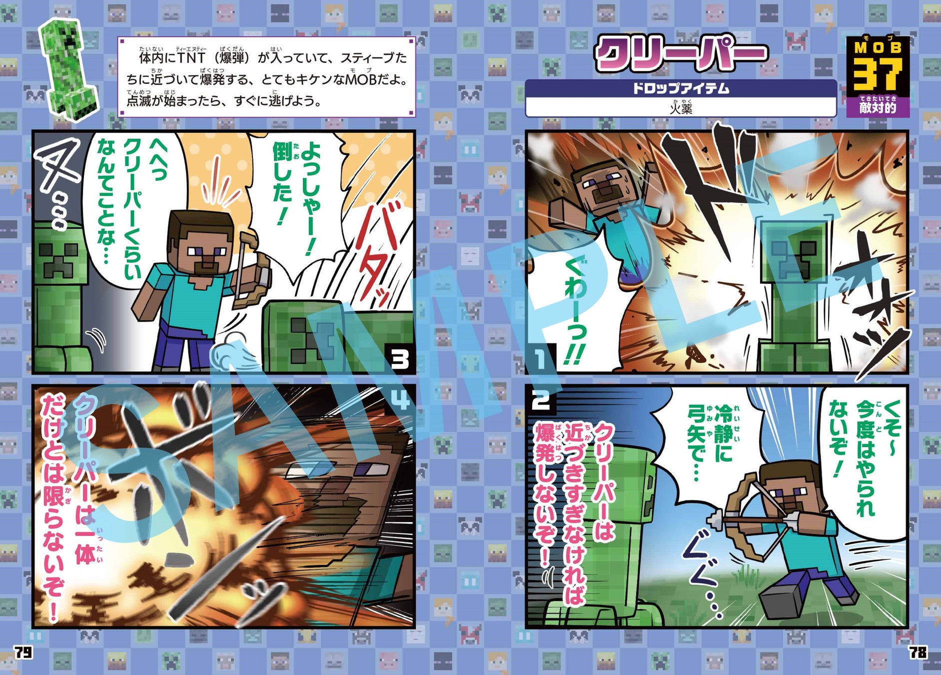 - 90種類のMOBやアイテムをユーモア満載の4コマまんがで紹介。
