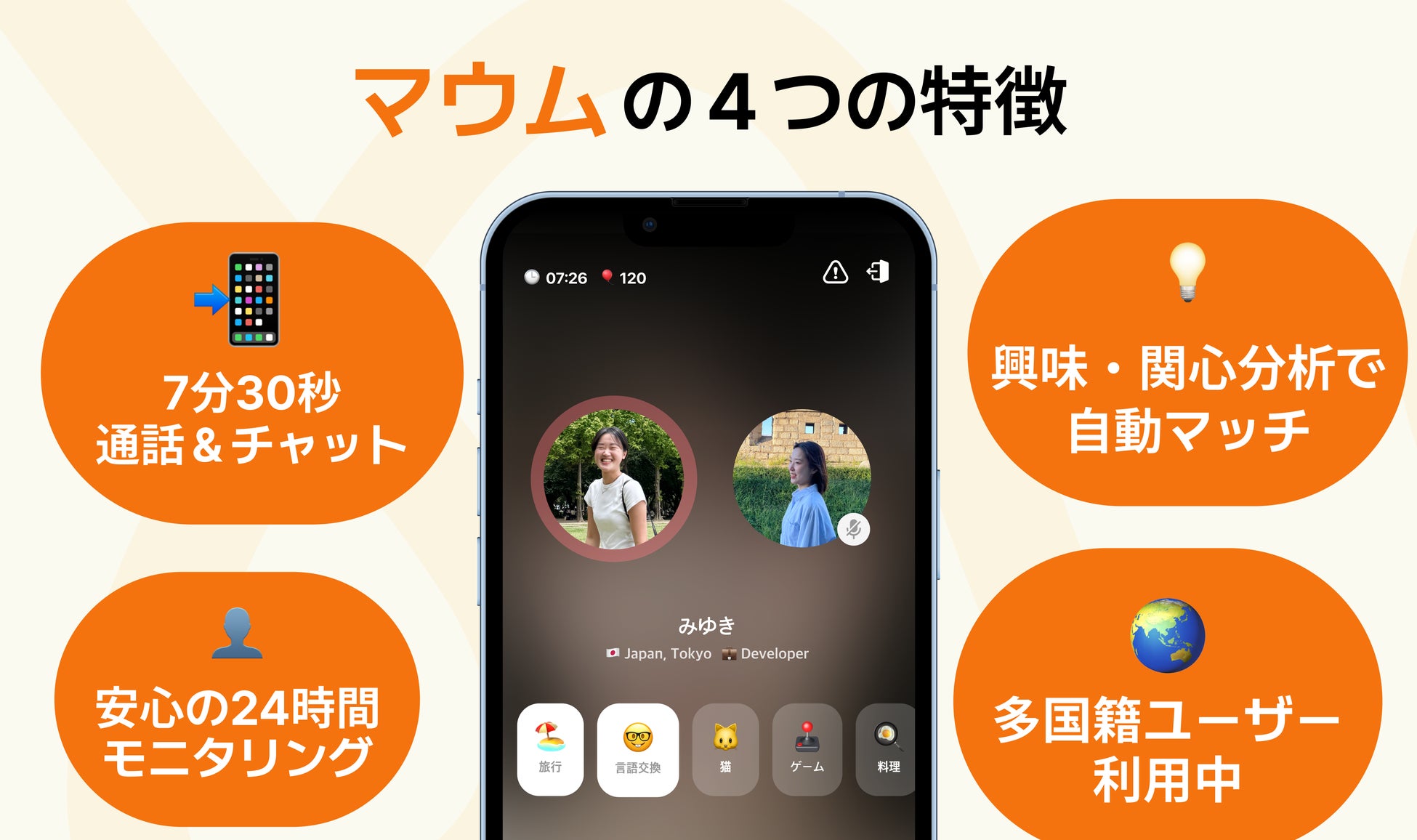 特徴として、7分30秒の時間制限や興味に基づく自動マッチング、24時間安心の報告システム、世界中の友達と繋がれる機能を持っています。