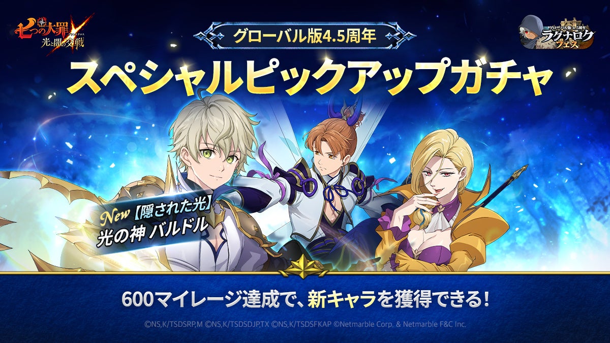 - 『七つの大罪 ~光と闇の交戦~』4.5周年を祝う「スペシャルピックアップガチャ」で新キャラ光の神バルドルが登場。