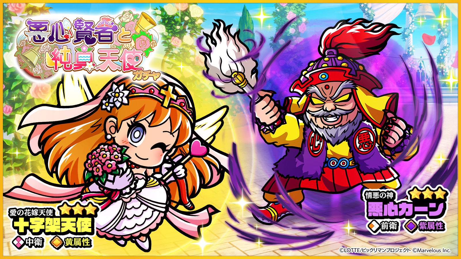 新キャラクターとして、ビックリマン公式イラストレーターによる☆3キャラクター[愛の花嫁天使]十字架天使と[情悪の神]悪心カーンが登場する「悪心賢者と純真天使ガチャ」も同時に開始され、8月23日まで楽しめます。