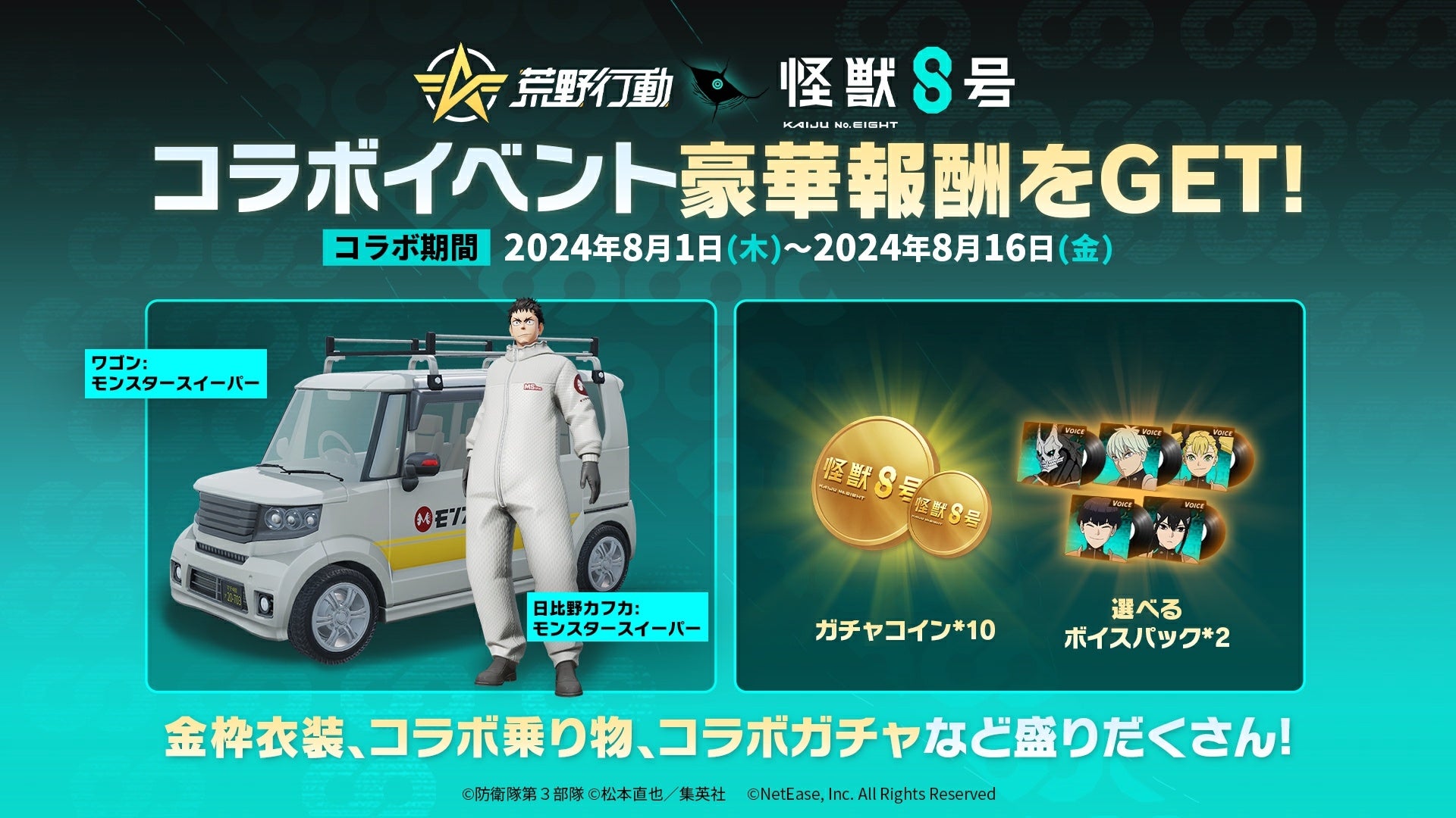 - 『荒野行動』が2024年8月1日から8月16日まで『怪獣8号』との初コラボを開催。