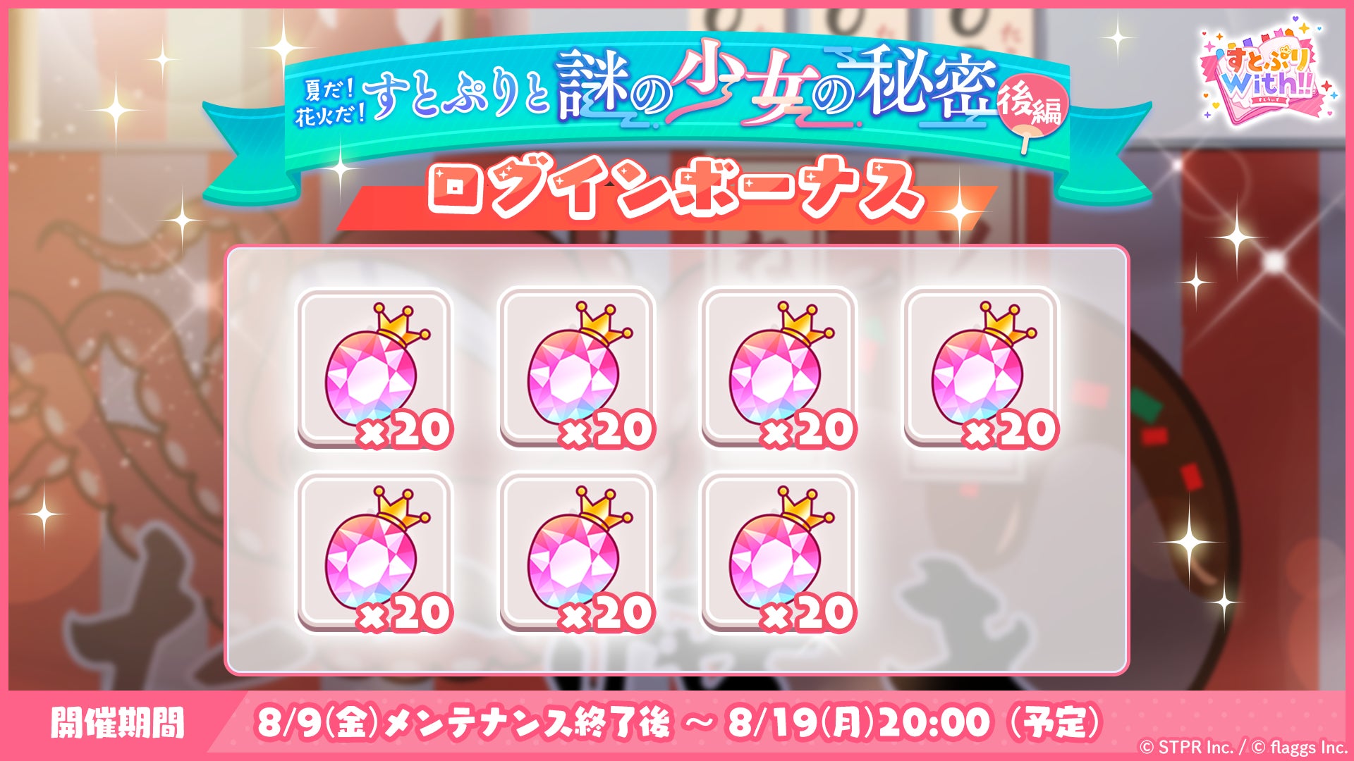- すとぷりの公式ゲームアプリ『すとぷりWith!!』で、8月9日からイベント「夏だ!花火だ!すとぷりと謎の少女の秘密 後編」を開催。