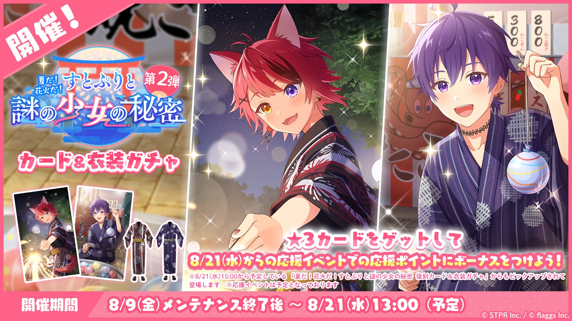 株式会社flaggsと株式会社STPRは、8月9日より「すとぷり」の公式ゲームアプリ『すとぷりWith!!』内で、8月のゲーム内イベント「夏だ!花火だ!すとぷりと謎の少女の秘密 後編」を開催します。