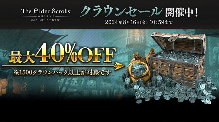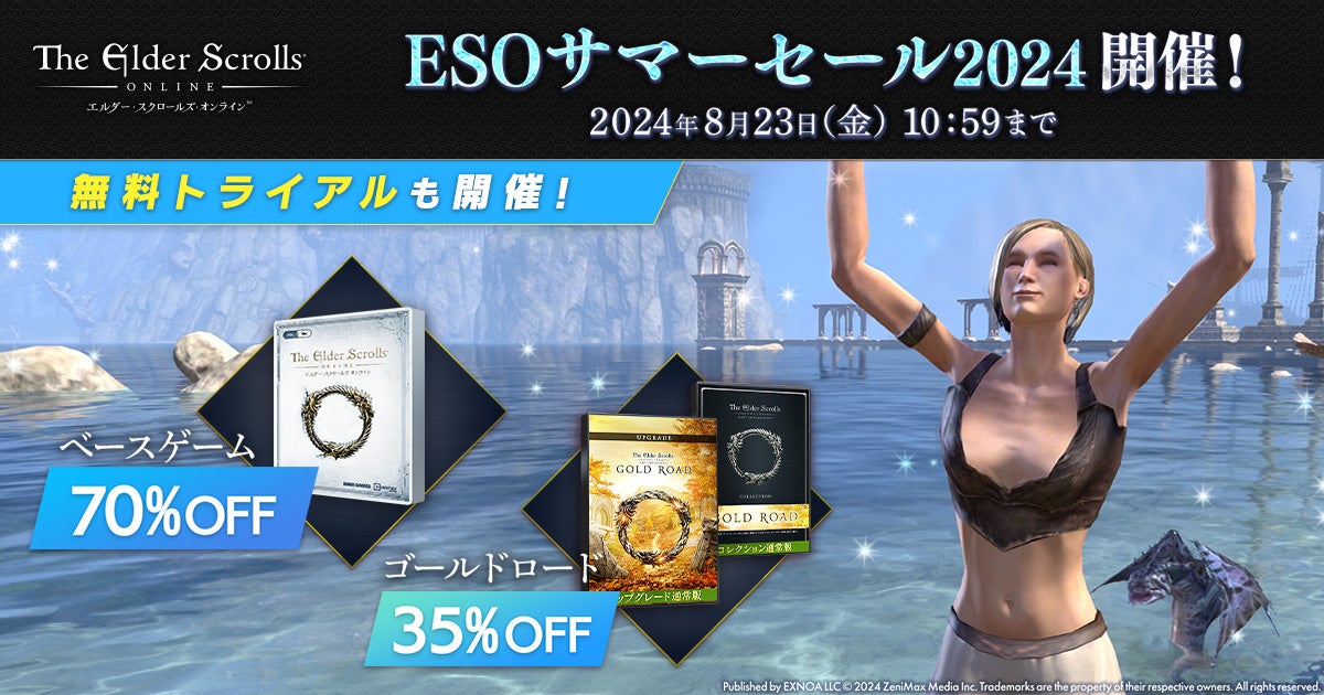 さらに、同時に「ESOサマーセール2024」も実施中で、ベースゲームが70%オフの792円(税込)で購入でき、最新チャプター「ゴールドロード」は35%オフで提供されています。