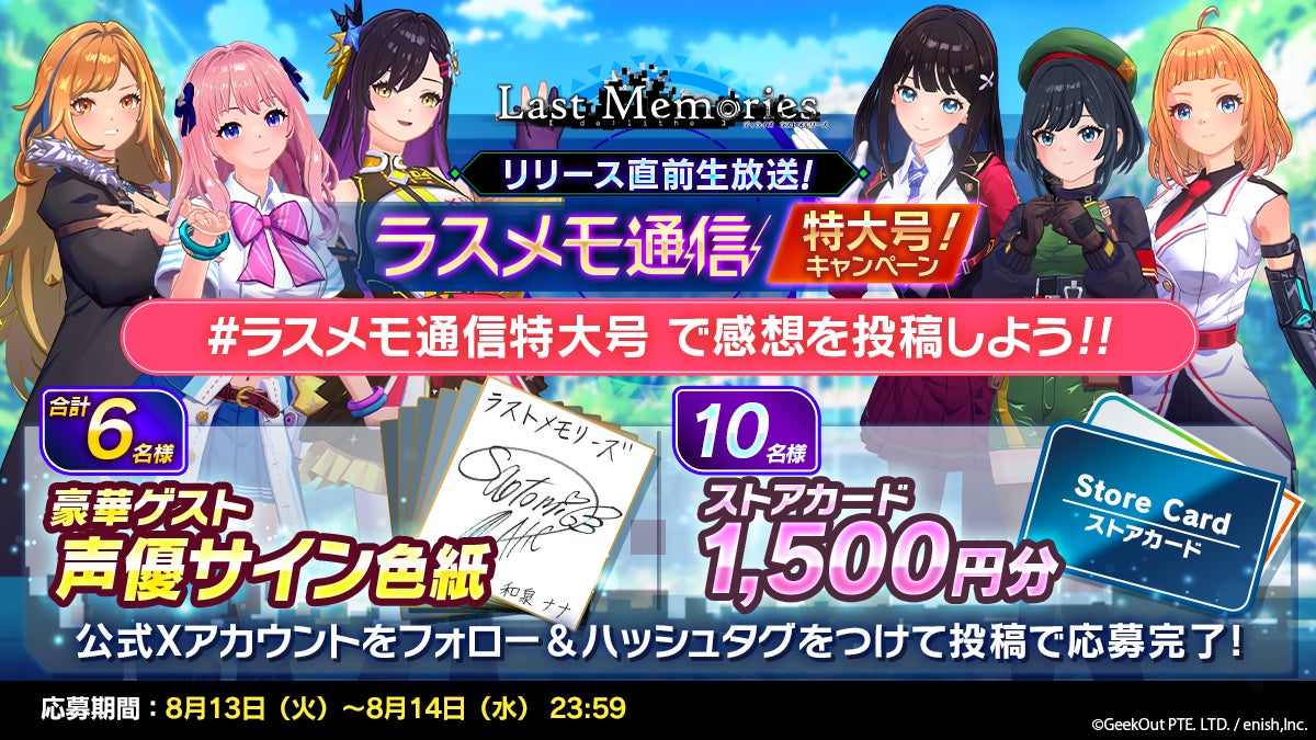 - 8月14日18時に生放送「ラスメモ通信特大号」が開催され、豪華声優陣が出演。