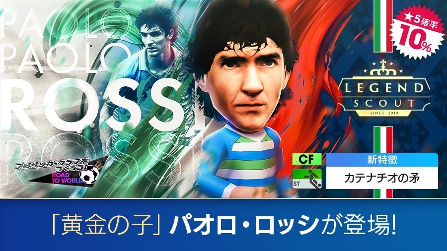 『プロサッカークラブをつくろう! ロード・トゥ・ワールド』にて、2024年8月14日からレジェンド「パオロ・ロッシ」を含むイタリアのスーパースターたちが新★5選手として登場する“LEGEND SCOUT”が開催されます。