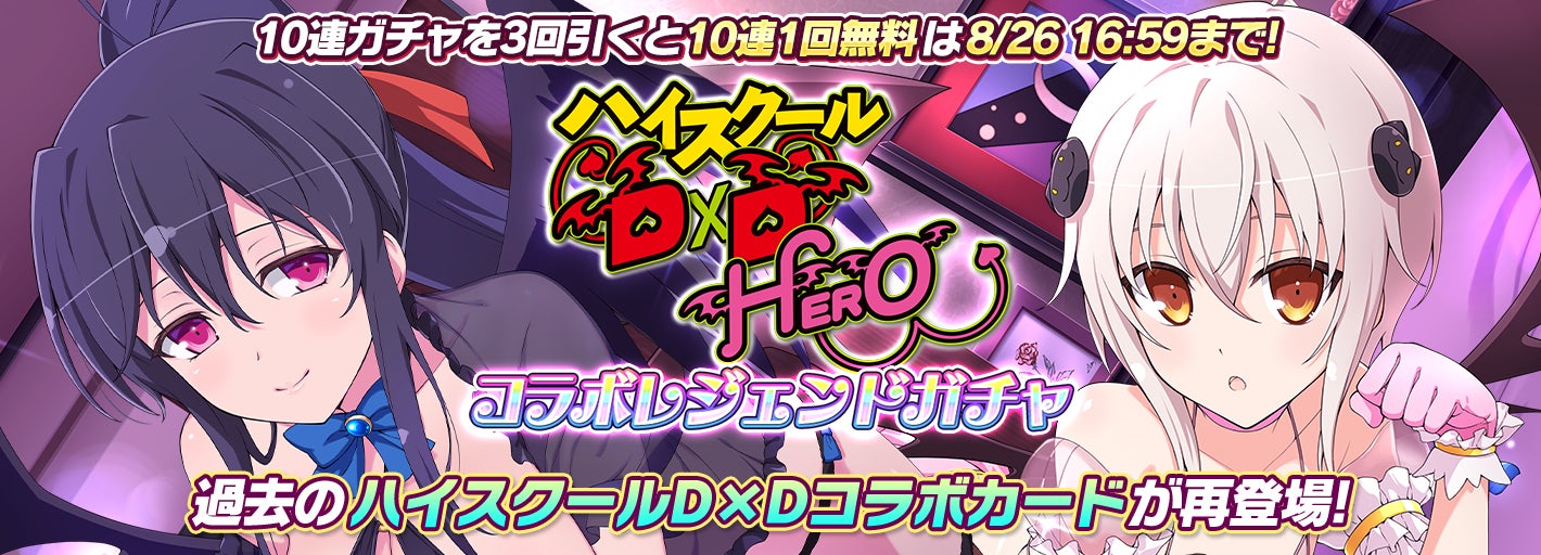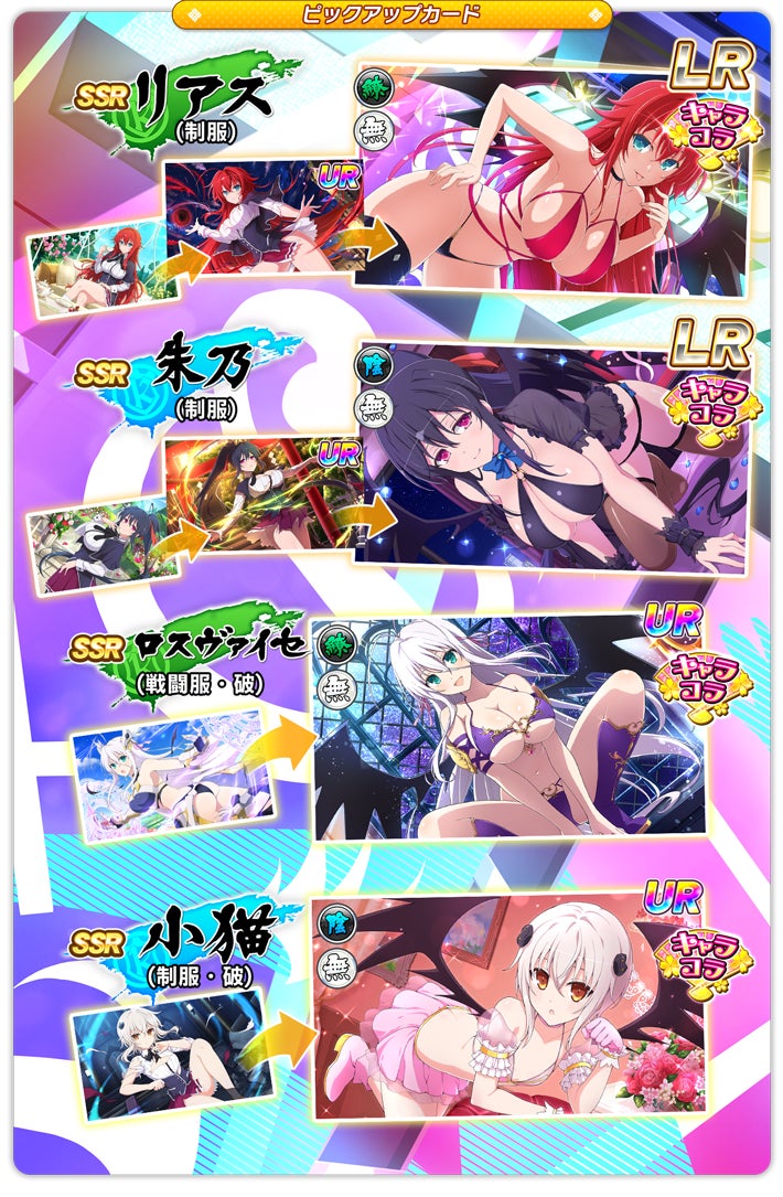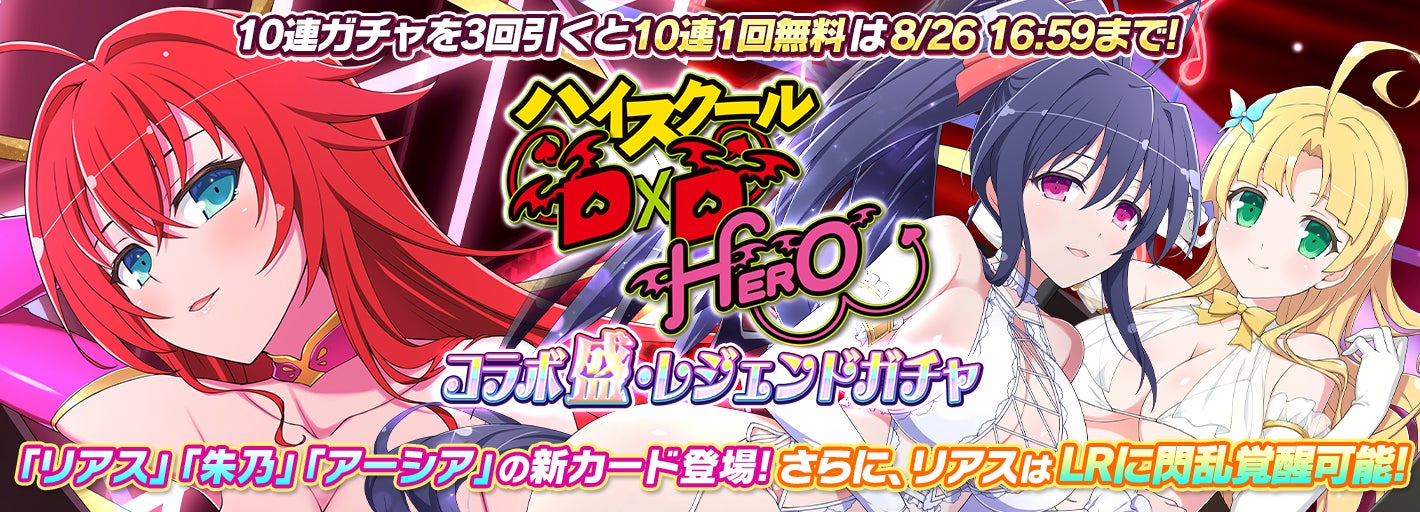 特に注目すべきは、「ハイスクールD×Dコラボ盛・レジェンドガチャ」で新カードの「リアス」がLRカードとして登場し、プレイアブルキャラ「アーシア」や「朱乃」の新カードも追加されます。
