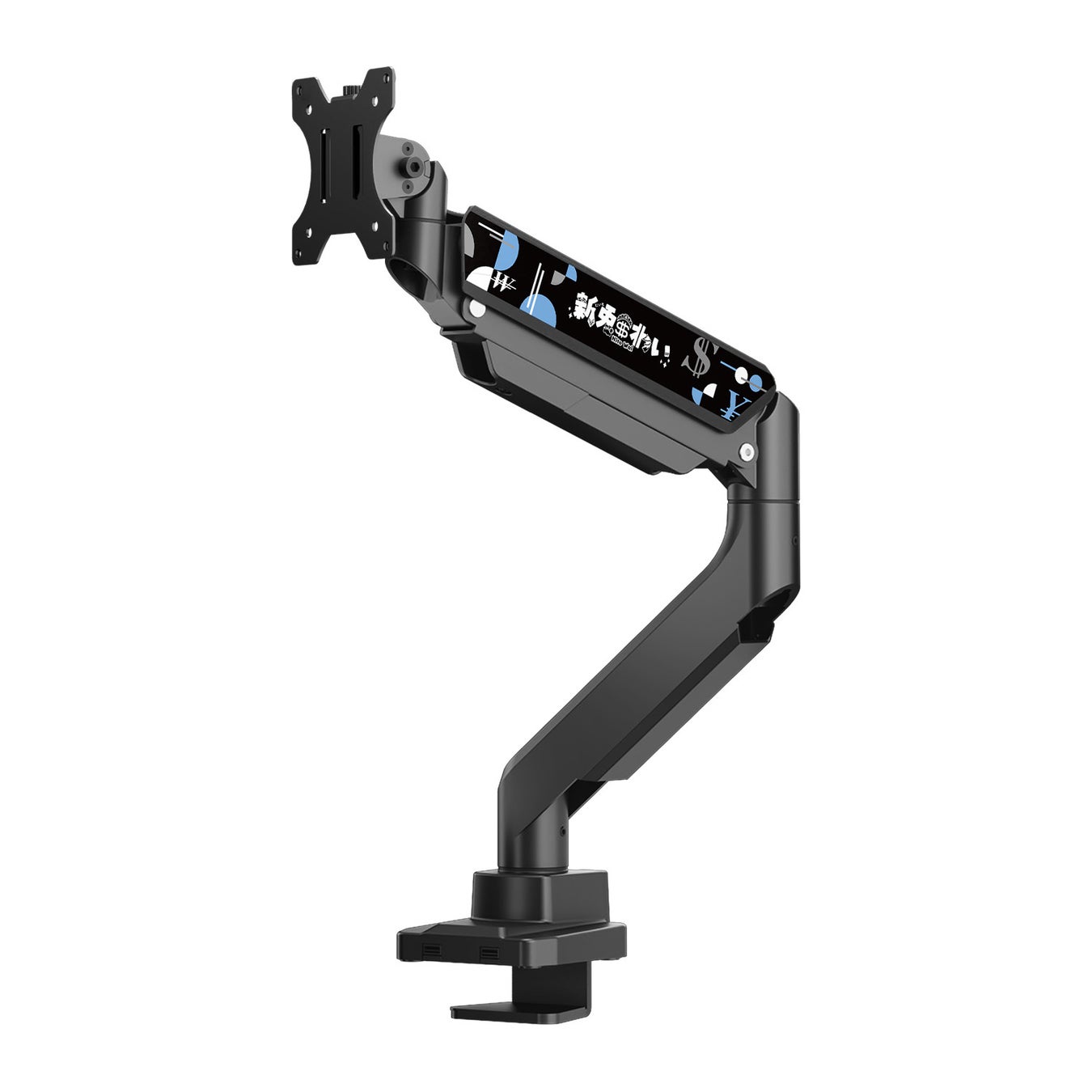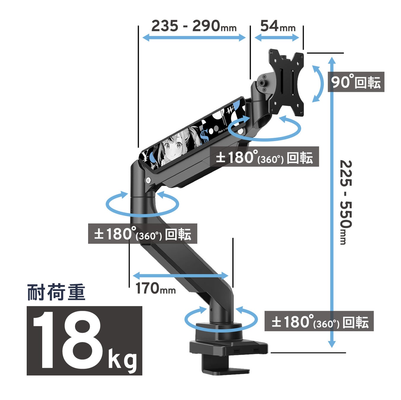 このモニターアームは、耐荷重2~18kgで、17-49インチの液晶ディスプレイに対応し、3関節のガススプリング式アームにより、自由にモニターの角度や高さを調整できるのが特長です。