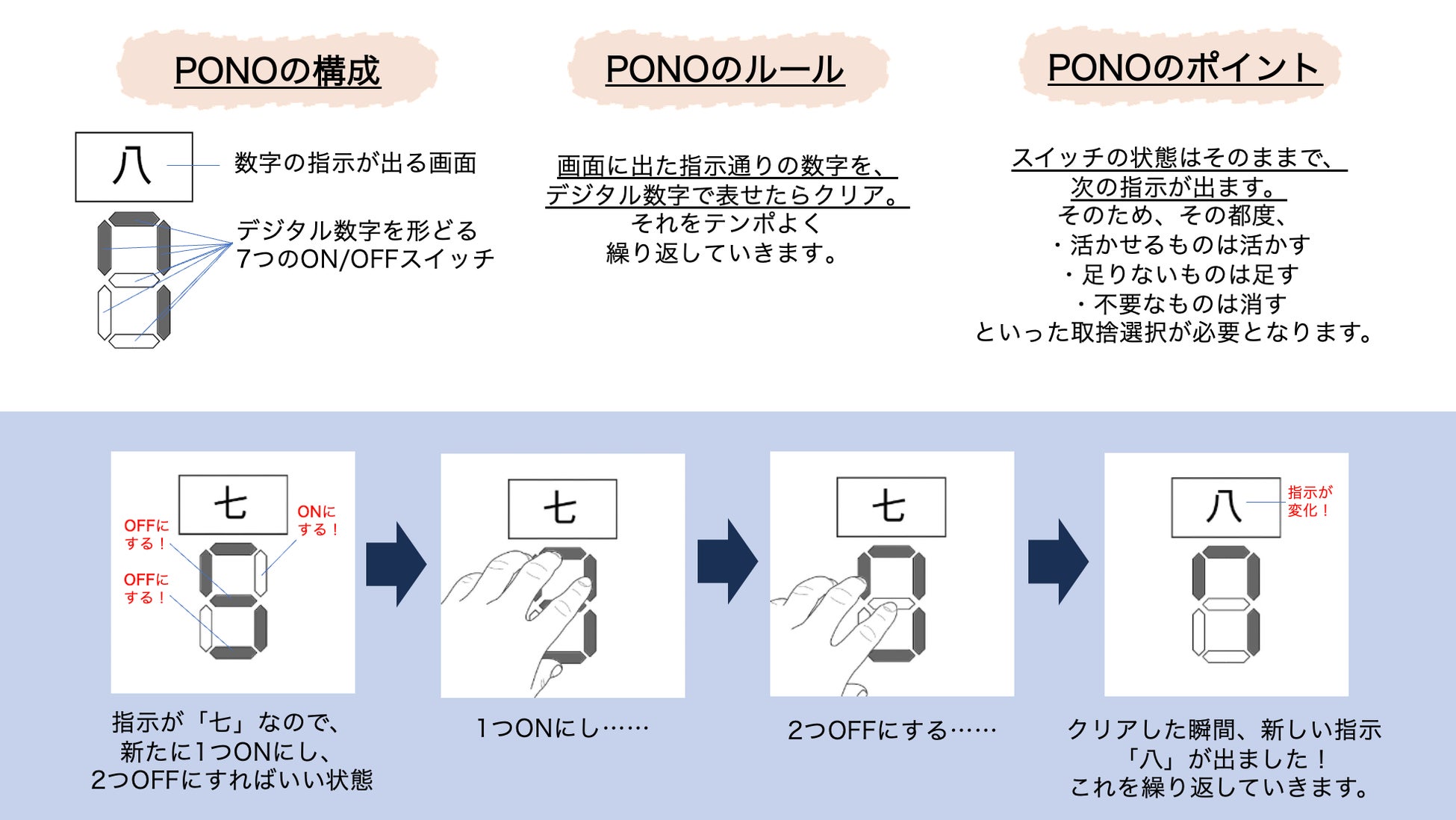 特許取得済みのこのゲームでは、画面に表示される数字を7つのON/OFFスイッチで表現するという動的な体験が特徴です。