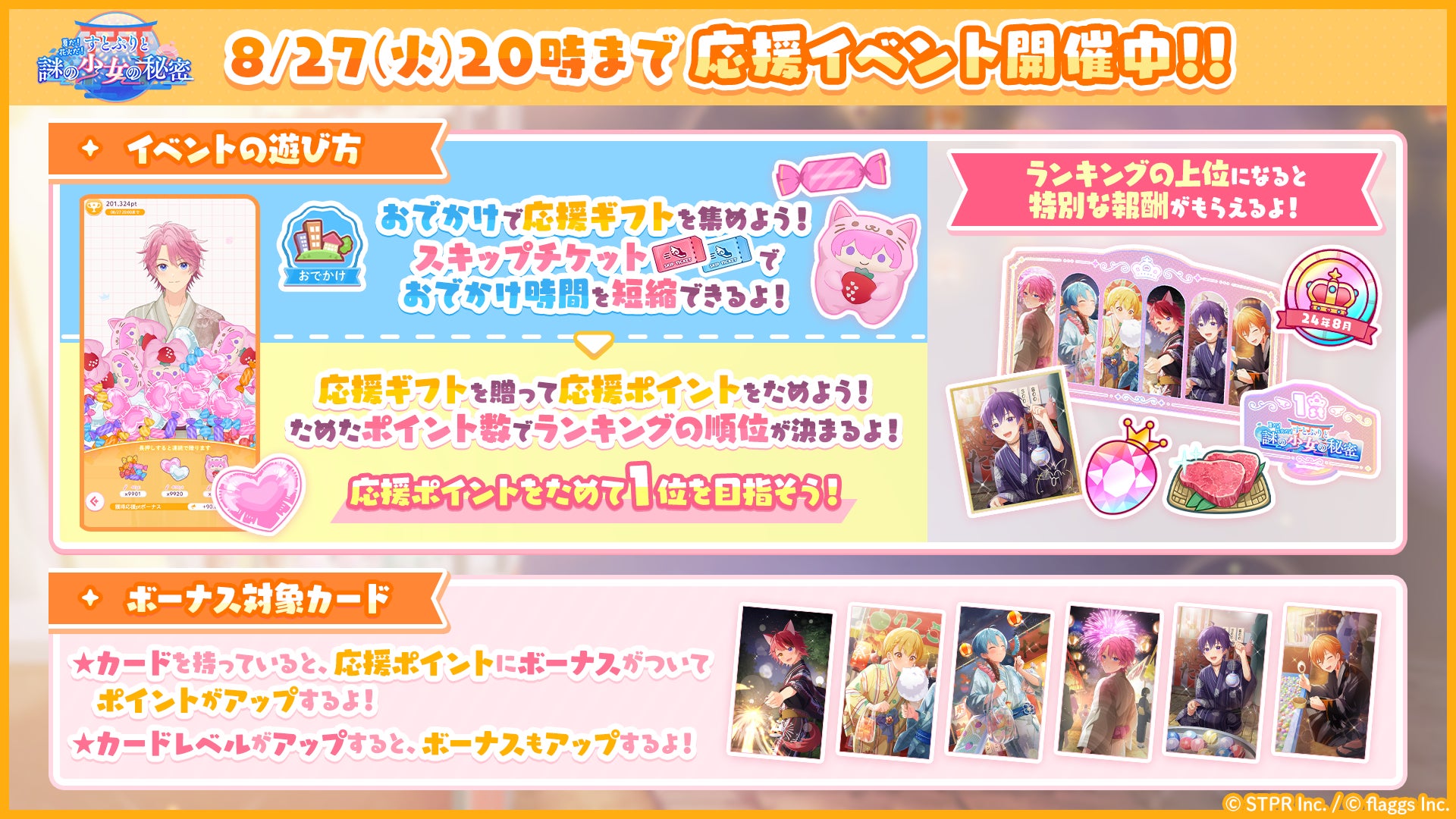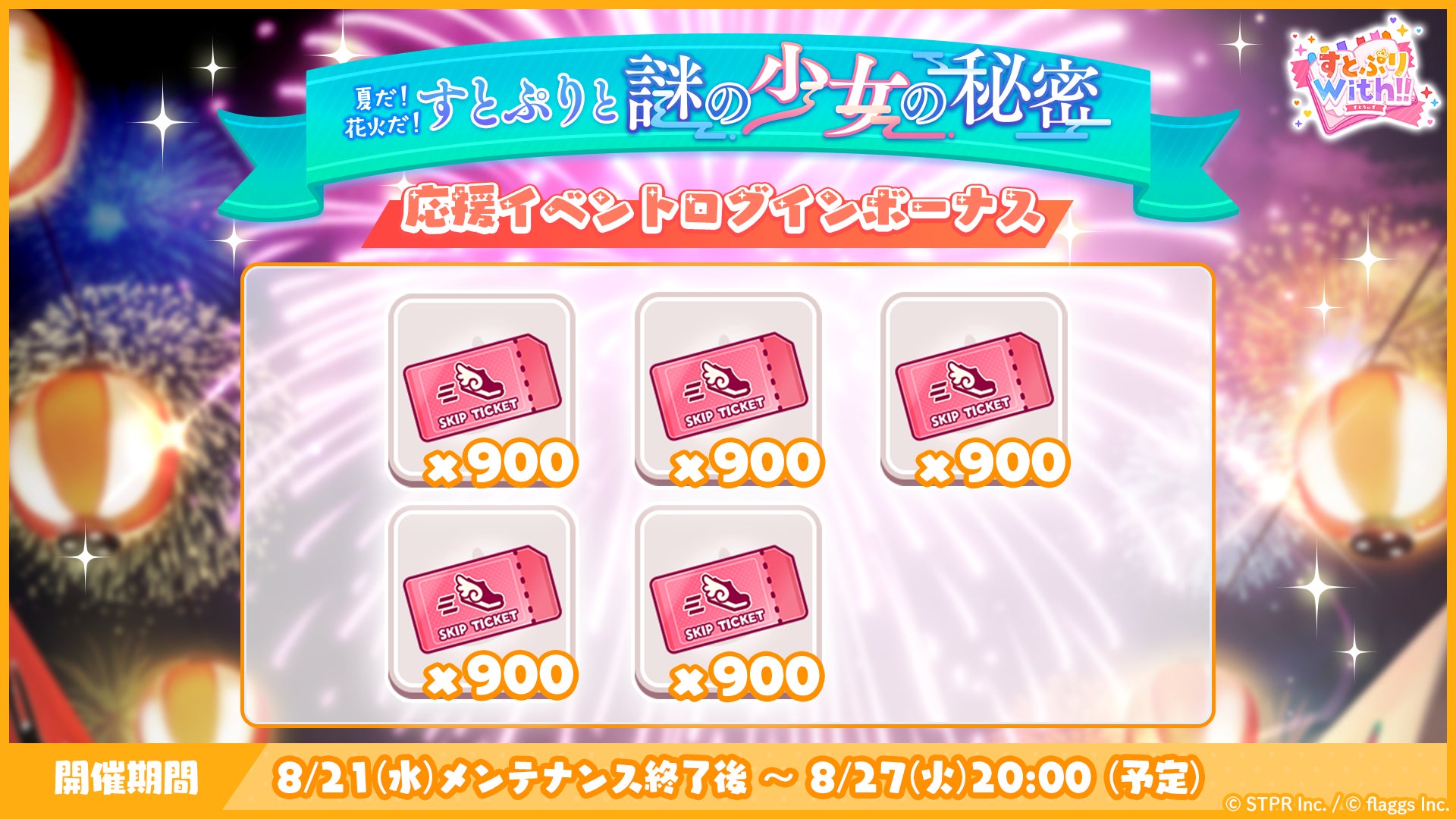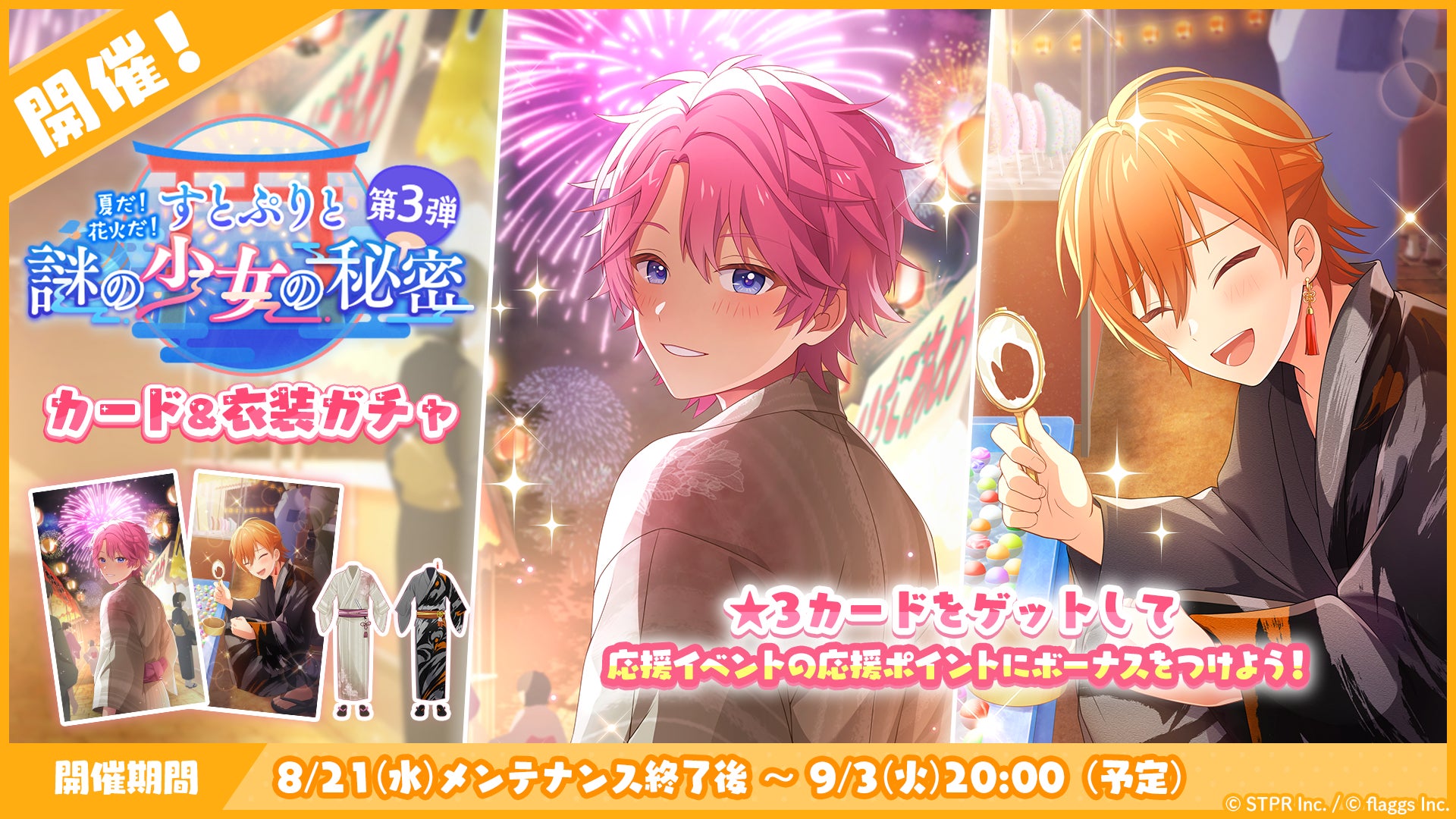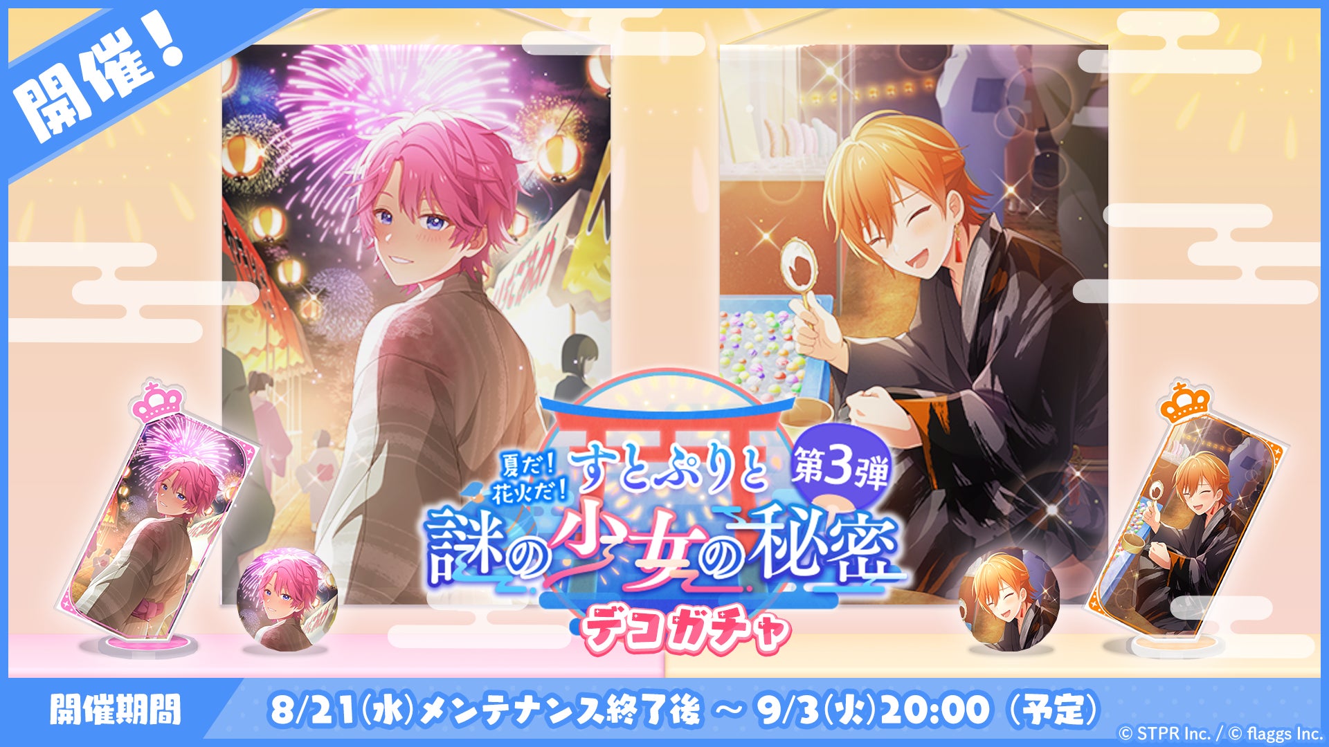 - 公式ゲームアプリ『すとぷりWith!!』でイベント「夏だ!花火だ!すとぷりと謎の少女の秘密 応援イベント」を8月21日から27日まで開催。