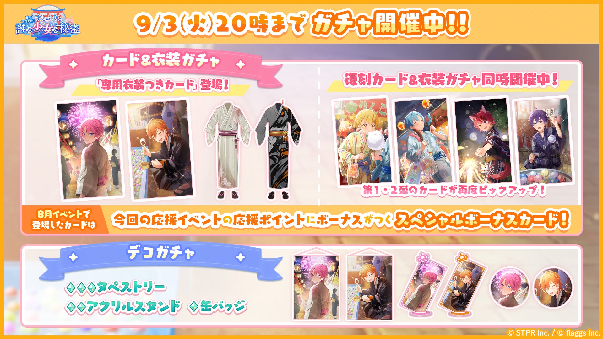- イベント専用エリア「神社(夏祭り)」や新カード&衣装ガチャも同時開催、魅力的な内容が盛りだくさん。
