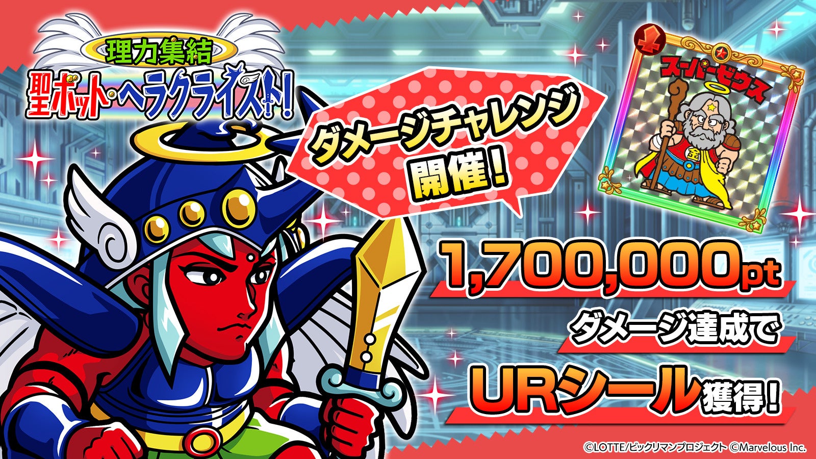 さらに、クエストクリアを記念して、1000ジェムがプレゼントされるほか、ダメージチャレンジイベント「理力集結 聖ボット・ヘラクライスト!」も実施され、報酬としてURシール「全能の神」スーパーゼウスが獲得できる機会があります。