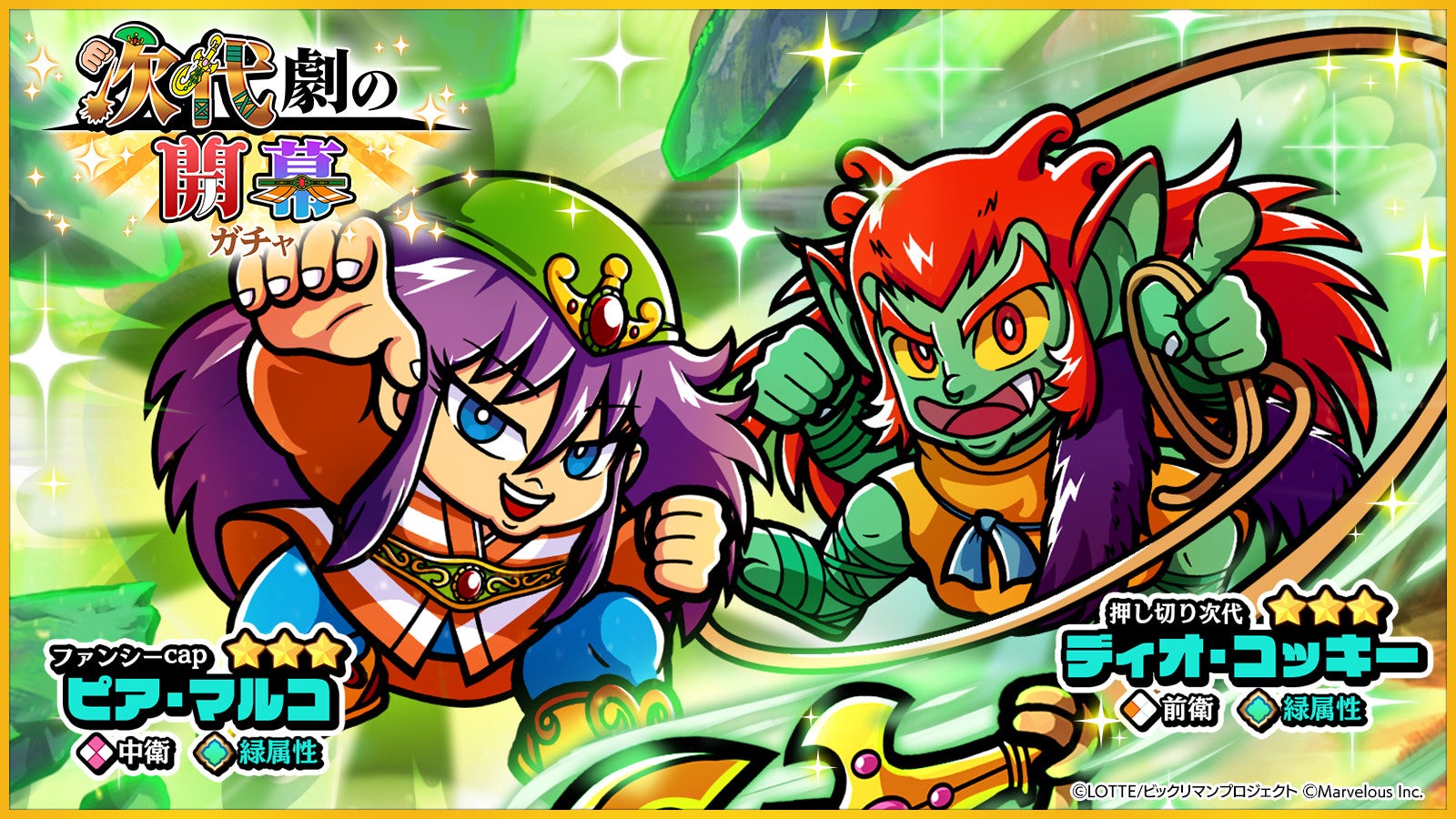 また、「次代劇の開幕ガチャ」も開催され、新たに登場したキャラクターは☆3ランクの「ファンシーcap」ピア・マルコと「押し切り次代」ディオ・コッキーです。