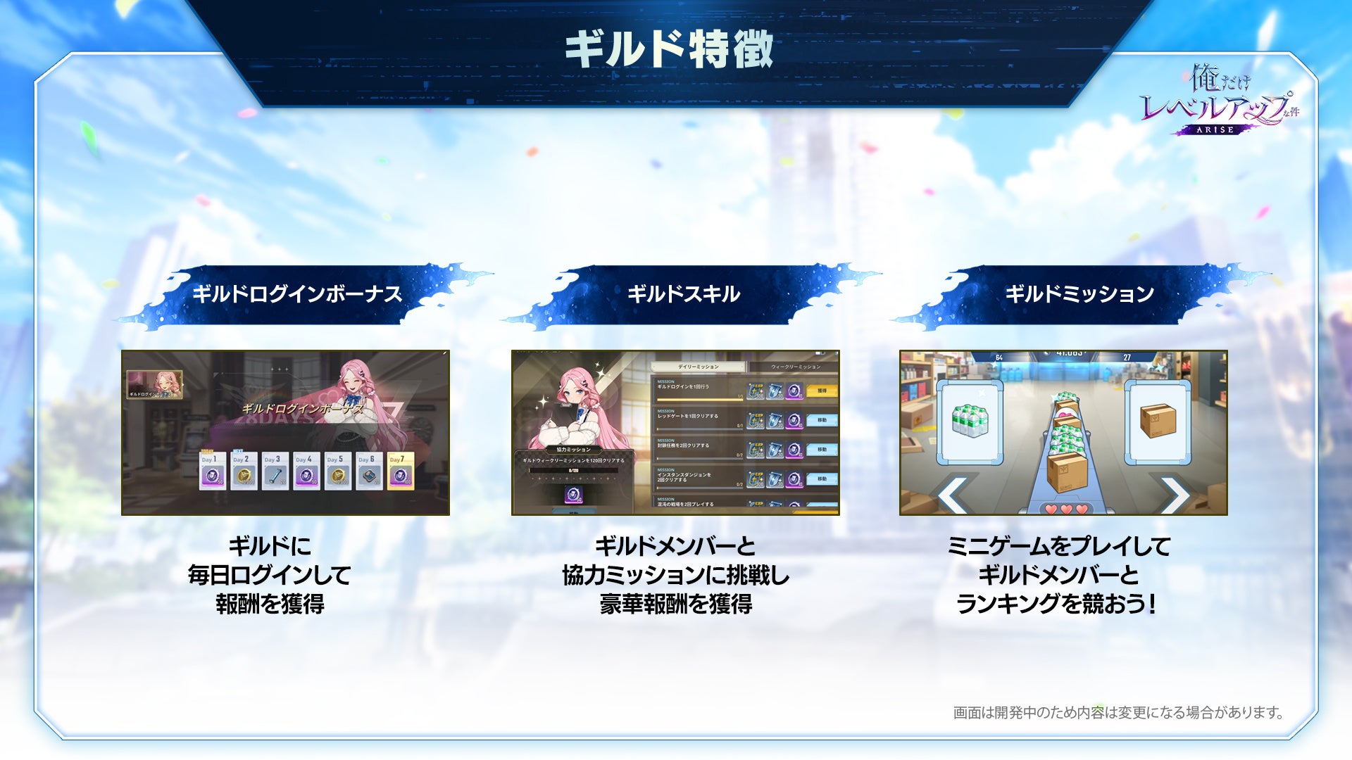 - 新ギルドシステム実装、ログインボーナスやミッションで仲間と協力可能。