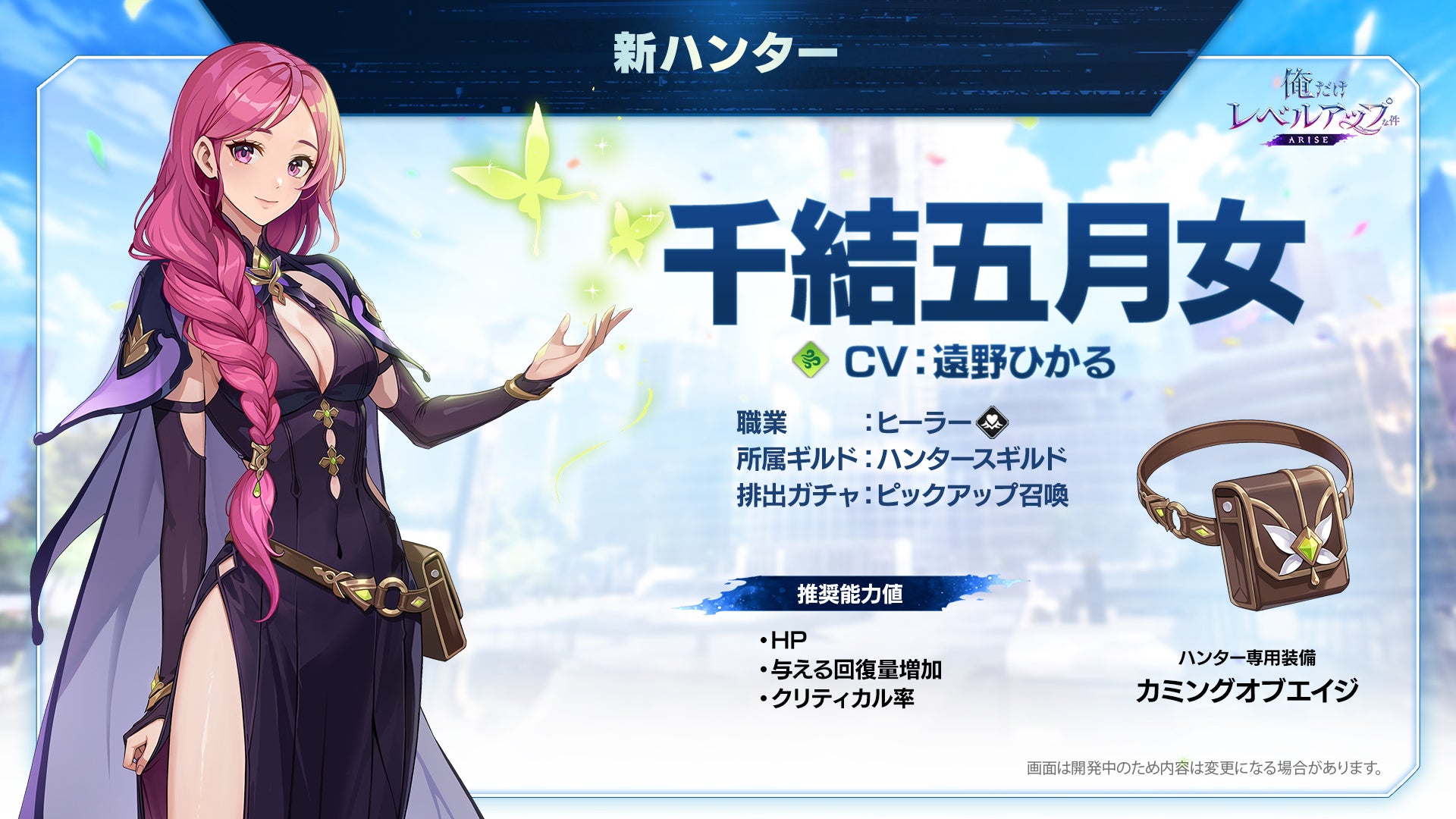『俺だけレベルアップな件:ARISE』の最新アップデートでは、新ハンターSSR「千結五月女」が登場し、風属性のヒーラーとして強力なスキルを持っています。