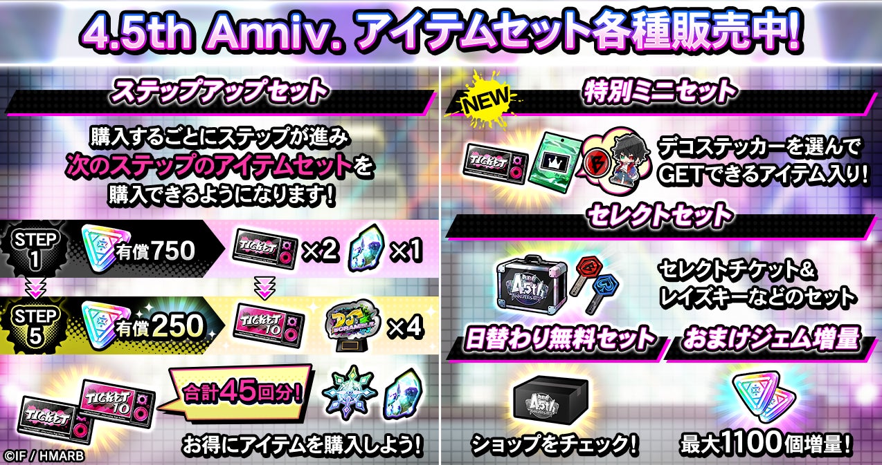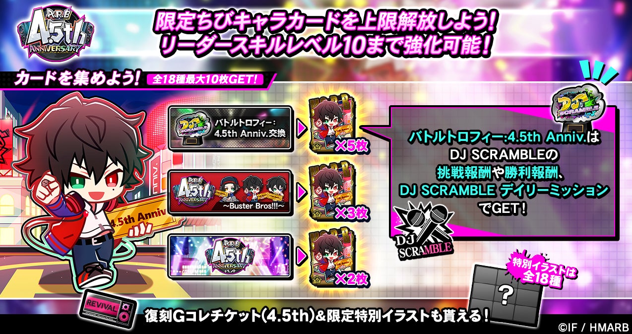 ゲーム内では、4.5th ANNIVERSARYを記念した特設ページが登場し、イベント「4.5th ANNIVERSARY」や、新コンテンツ「DJ SCRAMBLE」など、様々なキャンペーンが実施されます。