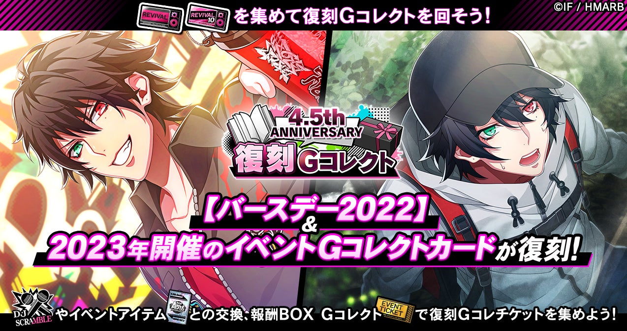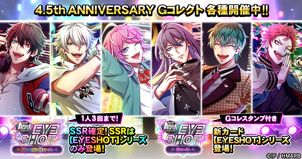 さらに、6ディビジョン全18キャラクターの【EYESHOT】シリーズが手に入る「4.5th ANNIVERSARY EYESHOT Gコレクト」や、過去のイベント限定SSRカードが手に入る「4.5th ANNIVERSARY 復刻Gコレクト」も開催されます。