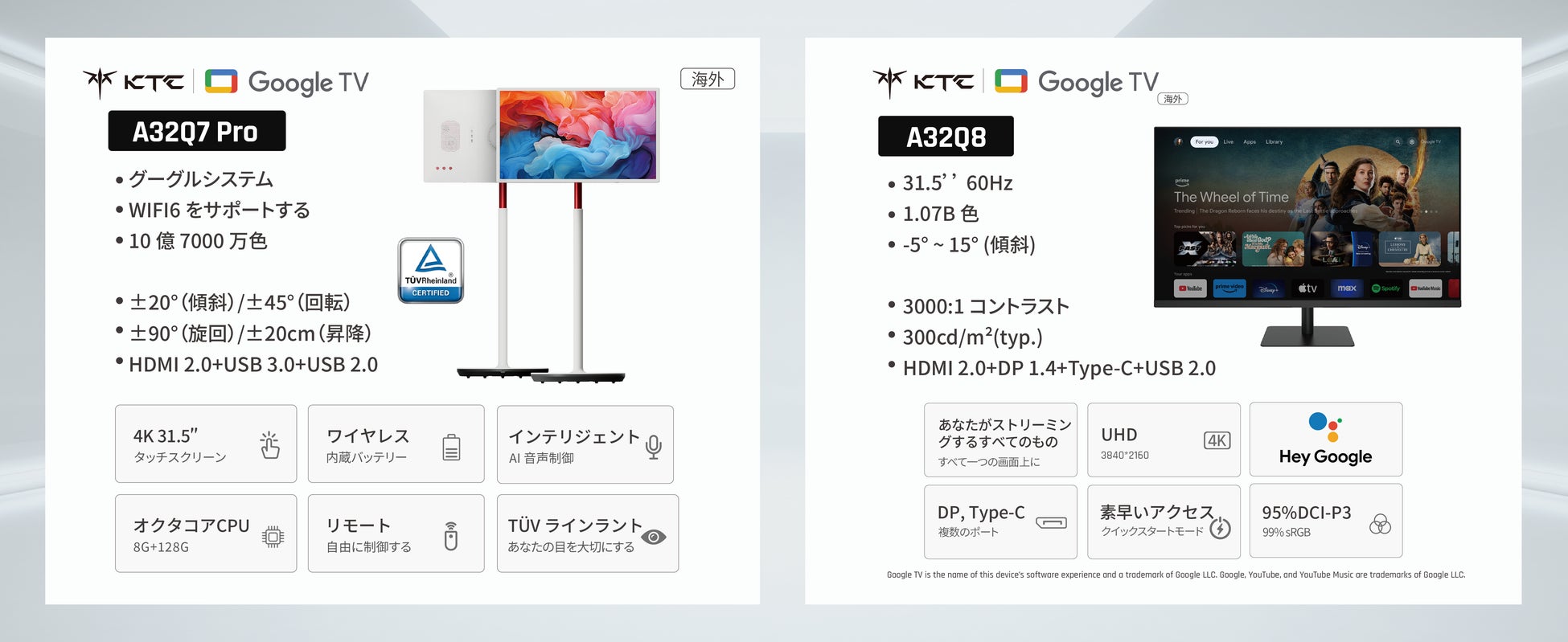KTCのスマートスクリーン「A32Q8」(32インチ)と移動可能なスマートパネル「A32Q7 Pro」(31.5インチ)は、Google TV認証を取得しており、エンターテインメントを豊かにします。