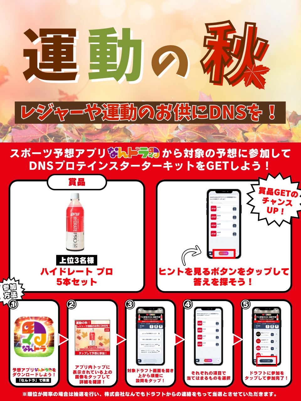 【スポーツニュートリションブランド「DNS」×「なんドラ」 】”運動の秋!レジャーや運動のお供にDNSを!”キャンペーン 開催!プロ野球勝敗予想で『ハイドレート プロ』プレゼント!!