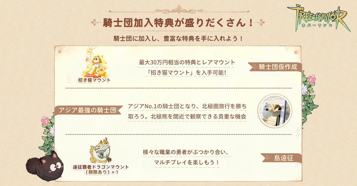 事前ギルド作成イベントもスタートしており、ギルドを先行して作成、または加入することで、豊富なゲーム内特典や、アジア限定の超レア招き猫マウントを獲得できます。