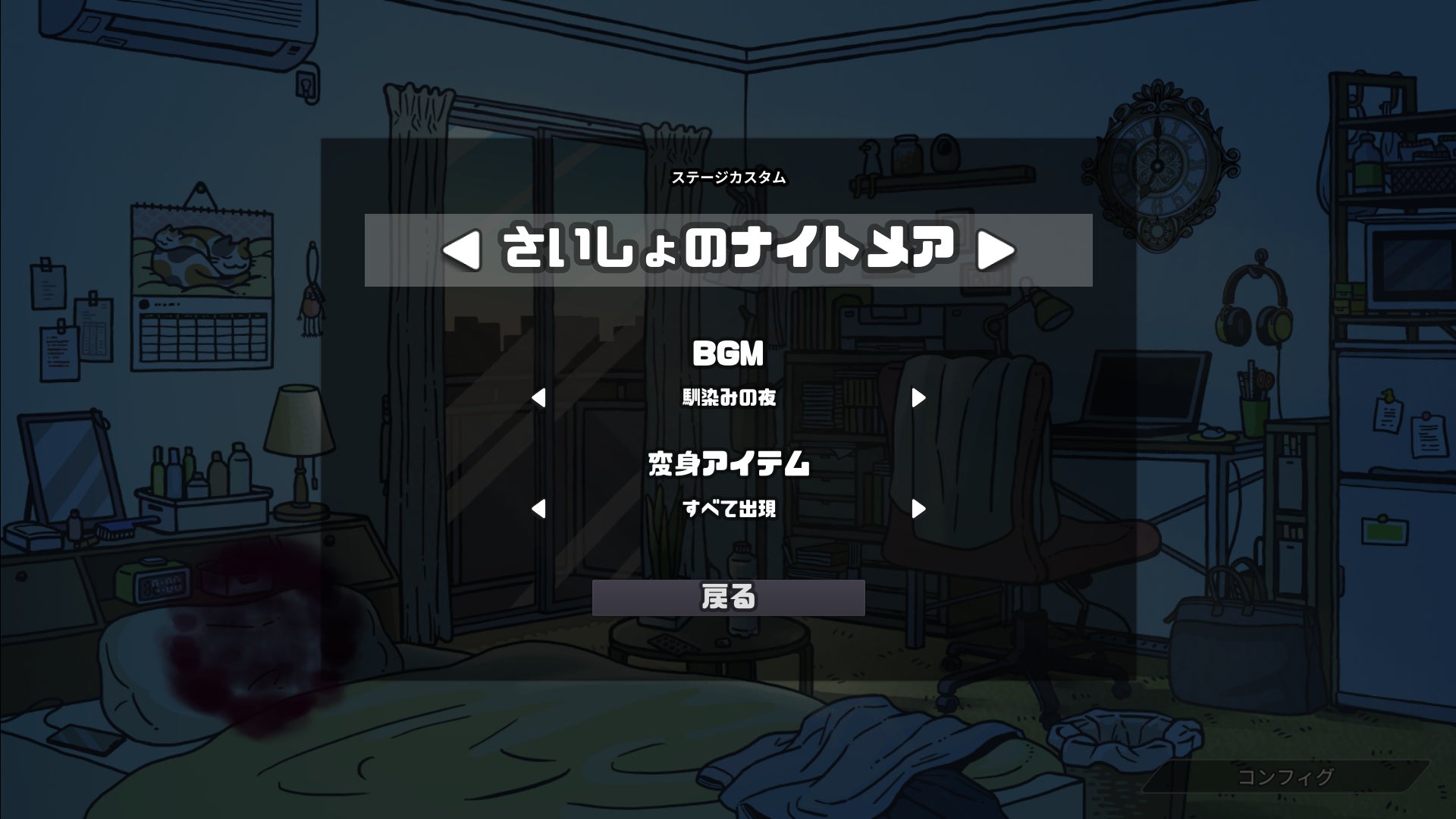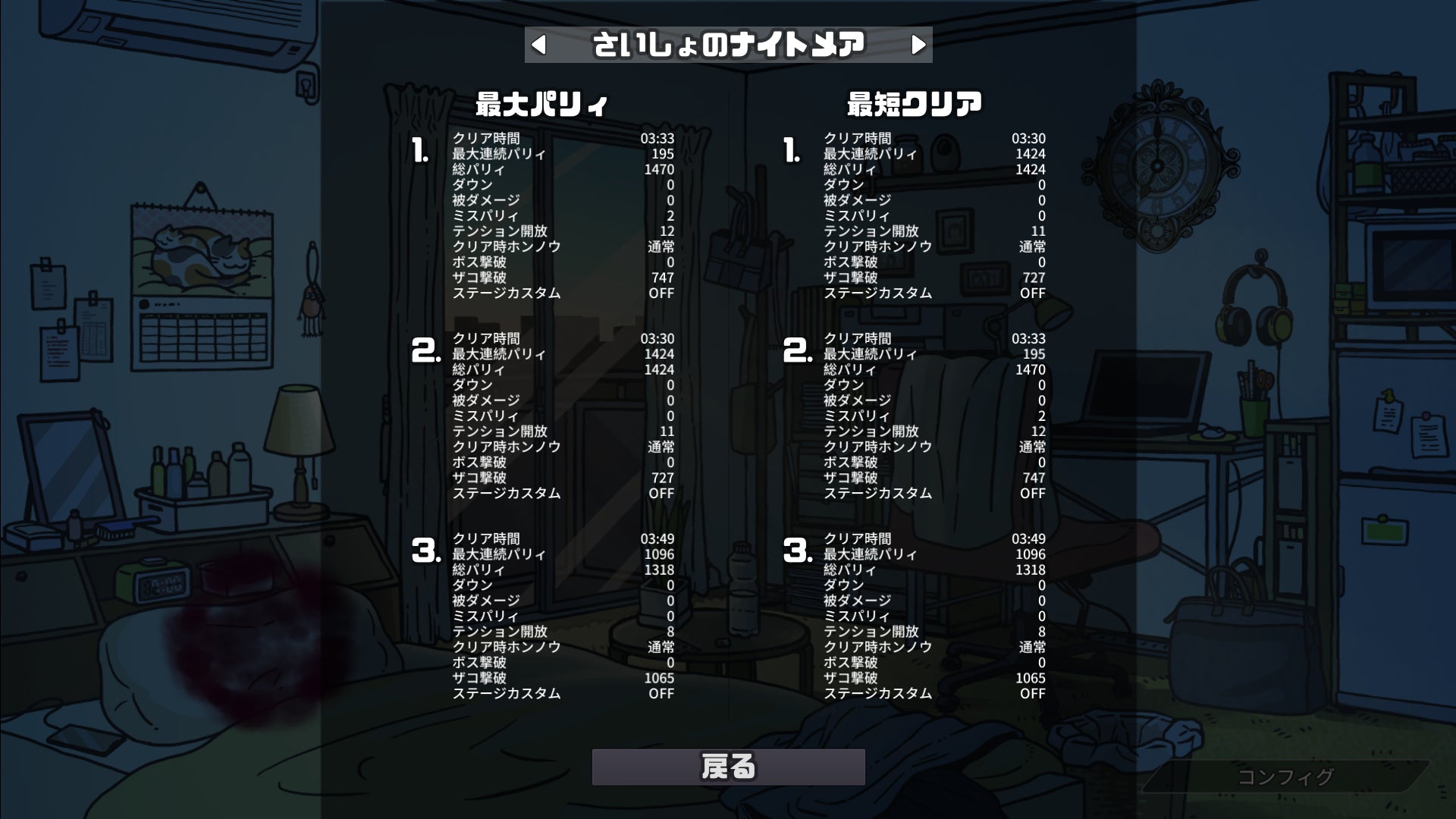 好きなステージを好きなBGMとホンノウちゃんで彩ったり、クリアしたステージの最速クリア記録や最大パリィなどの記録を確認できるようになります。
