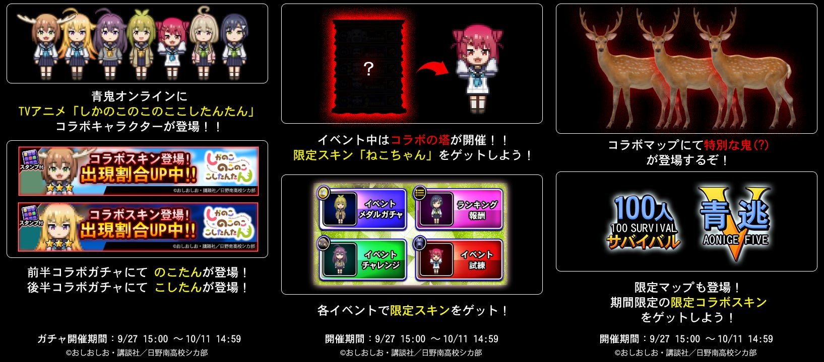 - 『青鬼オンライン』とTVアニメ『しかのこのこのここしたんたん』のコラボイベントが、9月27日(金)15時より開催。