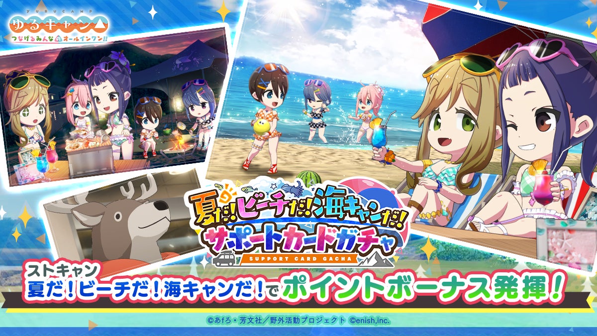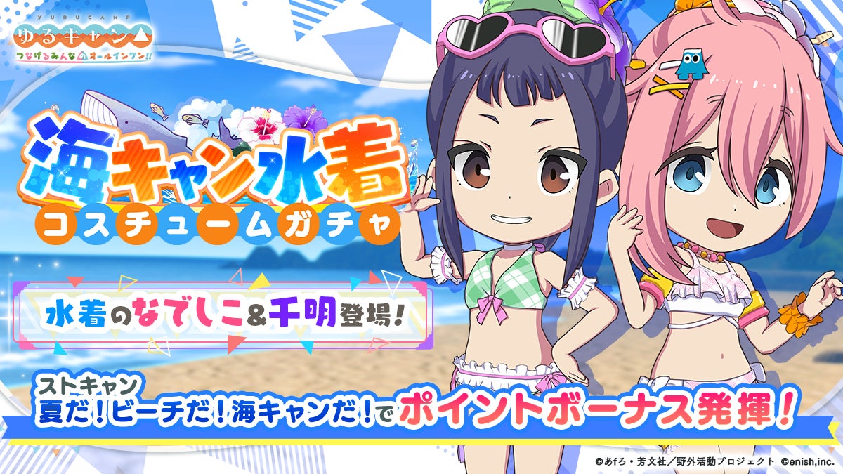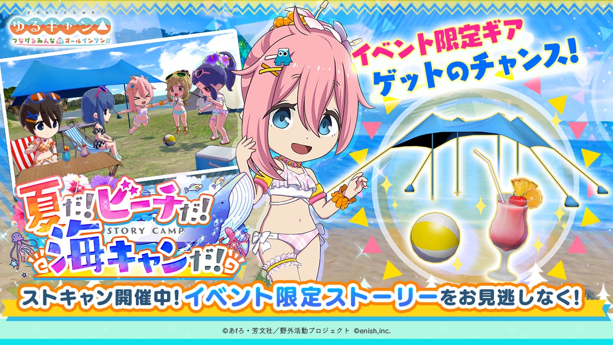 株式会社enishは、TVアニメ『ゆるキャン△』初のオンラインゲーム「ゆるキャン△ つなげるみんなのオールインワン!!」にて、夏の水着イベント「夏だ!ビーチだ!海キャンだ!」を開催します。