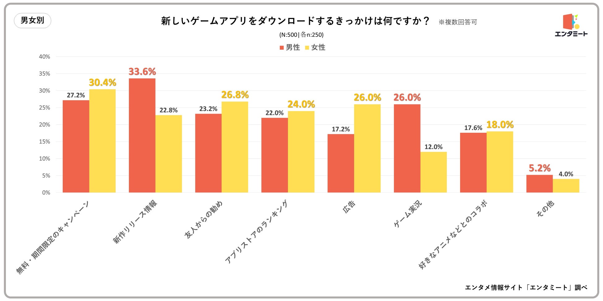 - 男女別では、男性は新作リリース情報、女性は広告や友人の勧めからダウンロードする傾向がある。