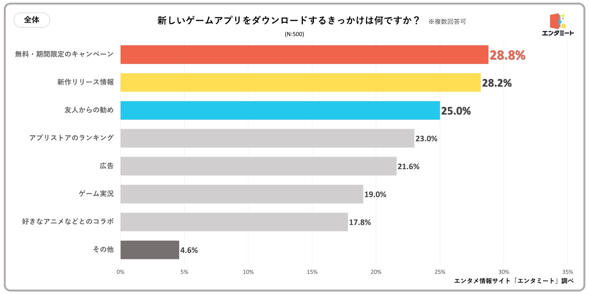 エンタミートが行ったアンケートによると、新しいゲームアプリのダウンロードのきっかけとして最も多かったのは「無料・期間限定のキャンペーン」で、全体の28.8%を占めました。