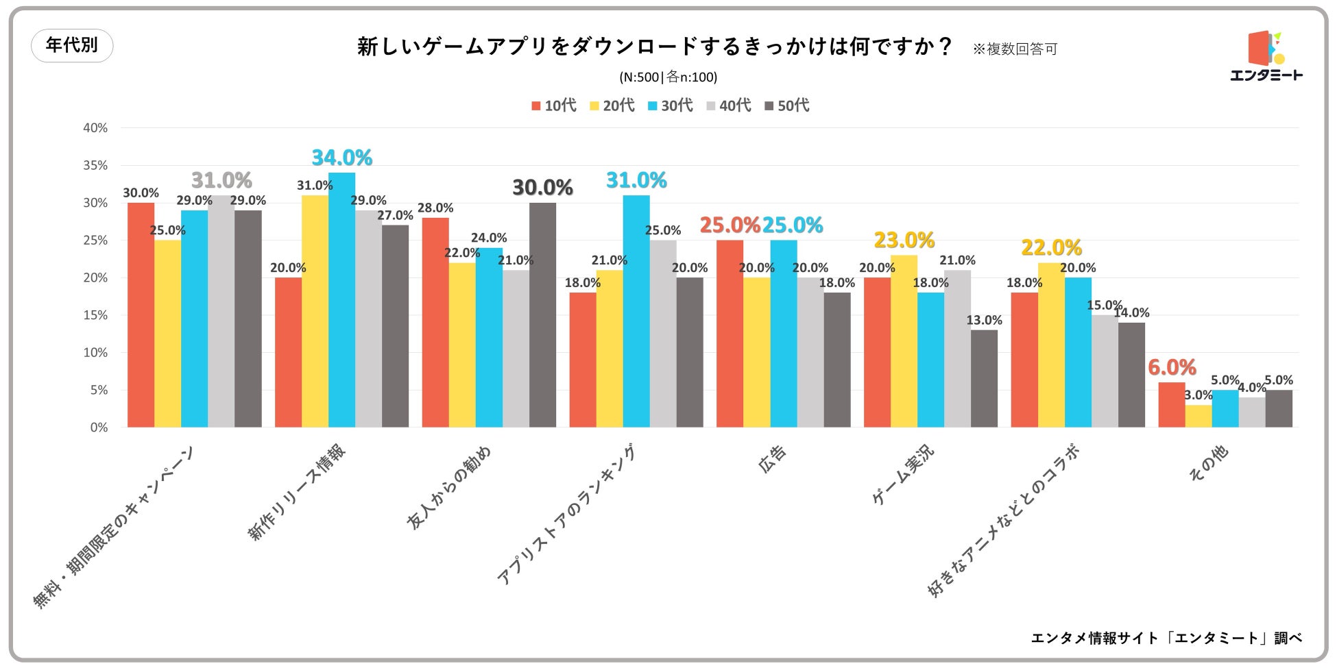 年代別では、20代から50代では「新作リリース情報」がダウンロードのきっかけとして30%前後を占めるのに対し、10代は20%にとどまりました。