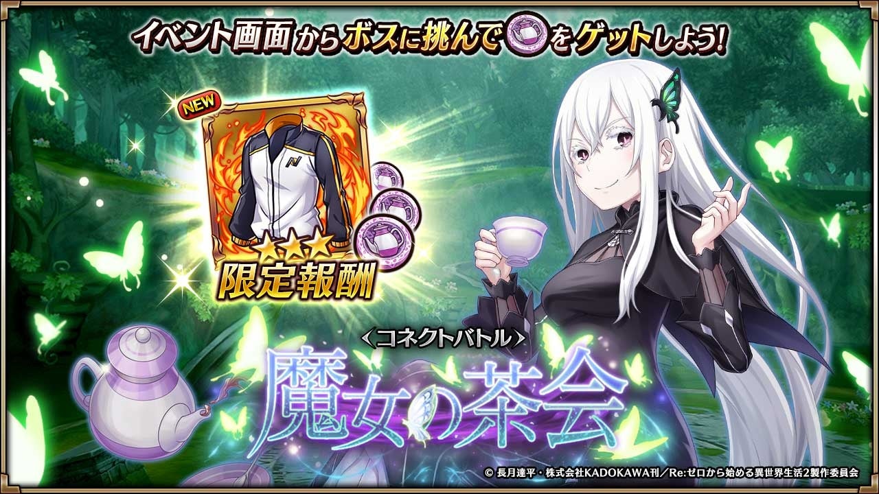 このイベントでは、人気RPG『ヴァルキリーコネクト』に「エミリア」「レム」「ラム」が登場し、さらに「エキドナ」もコネクトバトルのボスとして参戦します。