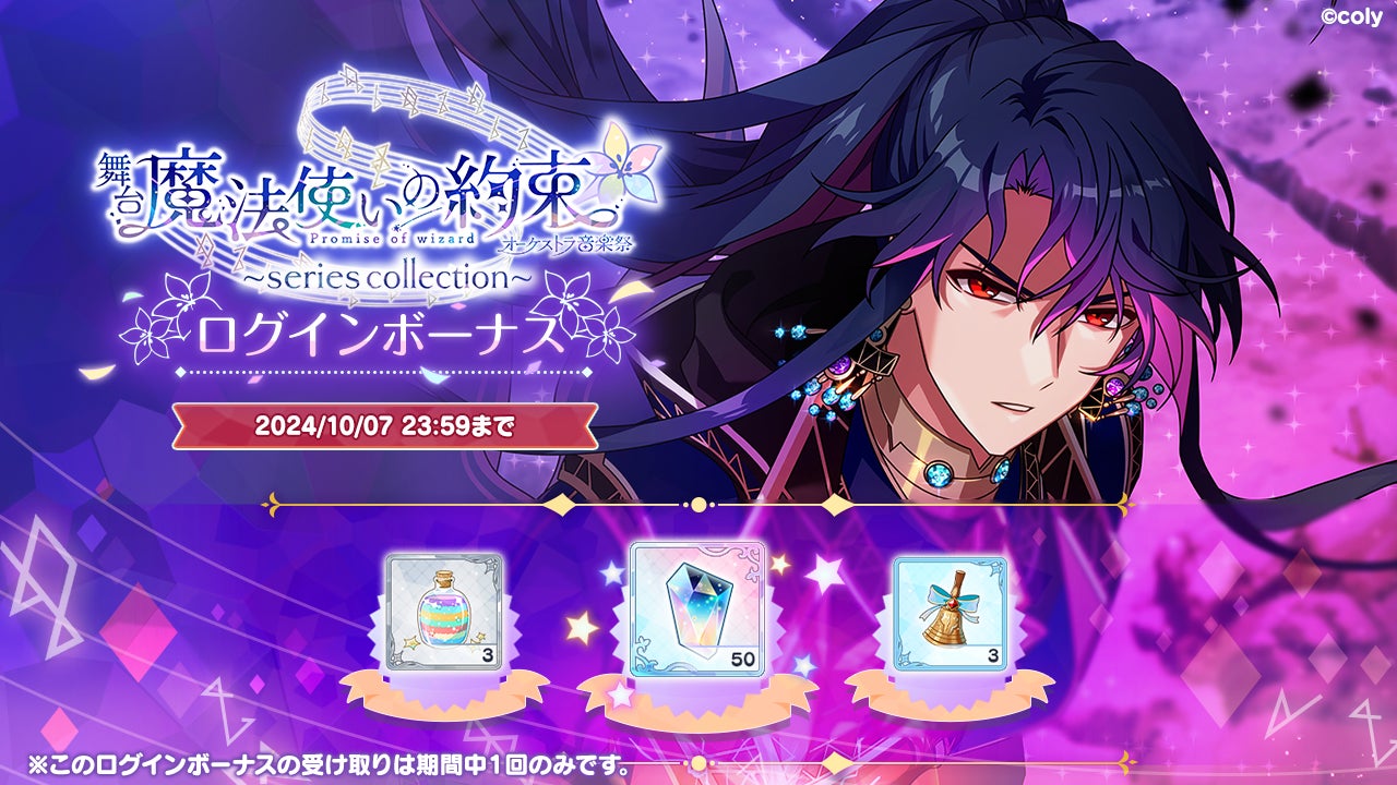 エチュードシリーズPart2開催記念ログインボーナスでは、マナ石50個、ガチャチケット3枚、エン10000が、オーケストラ音楽祭~series collection~開催記念ログインボーナスでは、マナ石50個、結晶パウダー大3個、魔法使いのベル3個がもらえます。