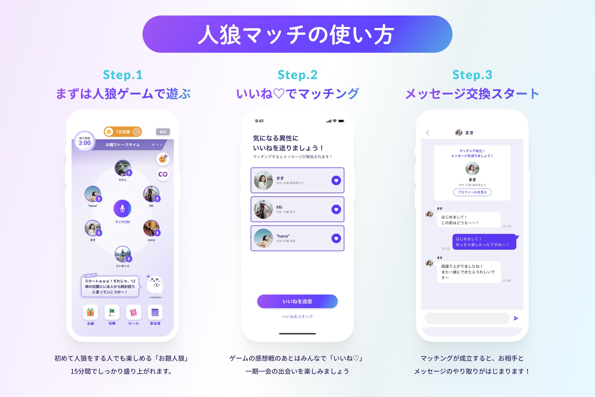 従来のマッチングサービスとは異なり、初めてのコミュニケーションは人狼ゲームで行われます。