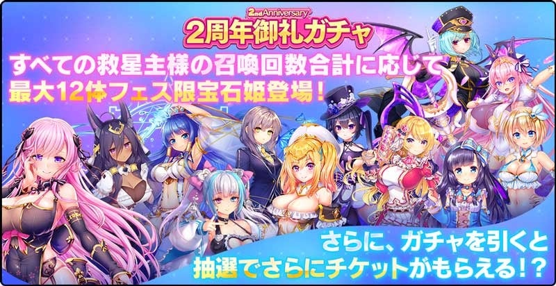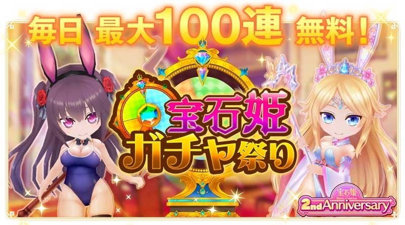 新ジュエルメイド「トラペゾヘドロン」が登場する「2周年メダル交換所」や、毎日最大100連無料でガチャが引ける「宝石姫ガチャ祭り」、期間中累計でガチャチケットが135枚もらえる「月間ログインボーナス2周年スペシャル」など、魅力的なキャンペーンが目白押しです。