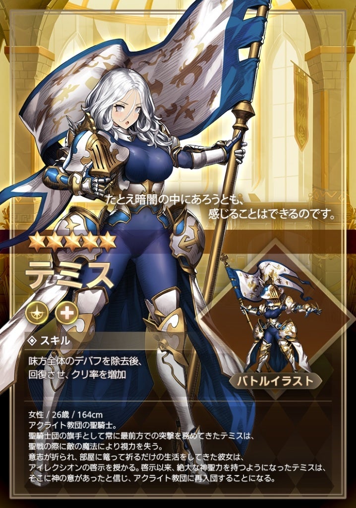 - テミスは味方のデバフを除去し、HPを回復する支援型騎士