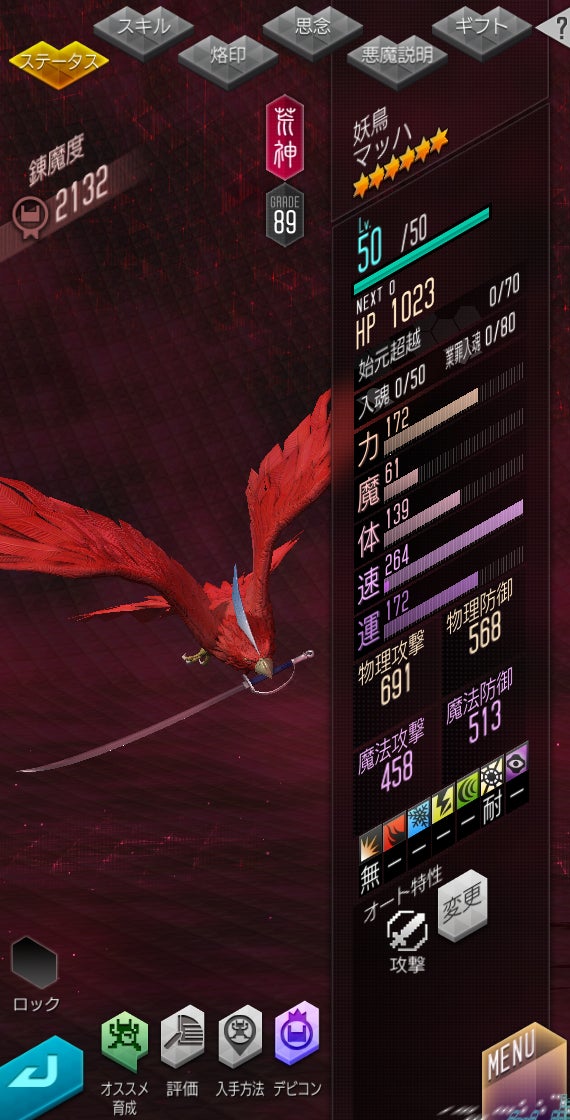 「妖鳥 マッハ」は、物理貫通と魅了無効を持ち、会心状態でバトルを開始する強力な悪魔です。