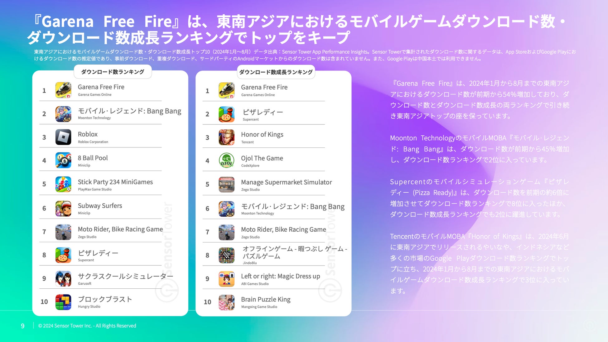 ダウンロード数ランキングでは、『Garena Free Fire』がトップを維持し、『モバイル・レジェンド: Bang Bang』が2位につけました。