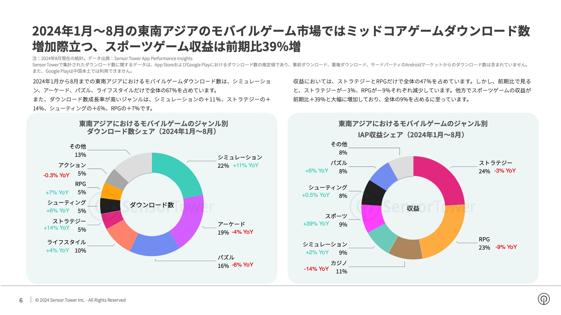 本レポートでは、東南アジアモバイルゲーム市場の収益、ダウンロード数、主要ジャンルの収益シェア、人気タイトルのランキング、市場進出事例などを詳しく分析しています。